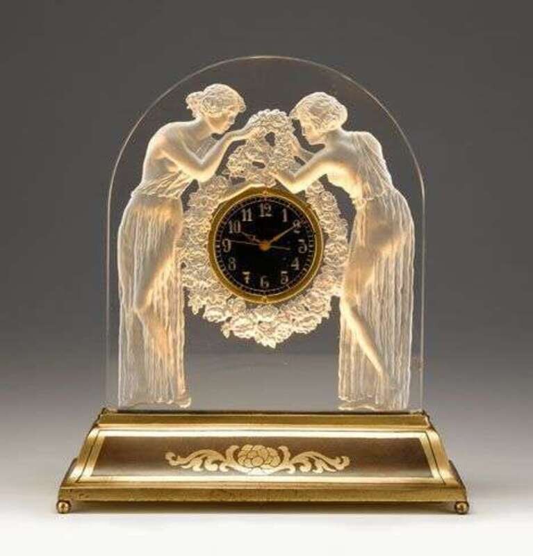 In the style of Rene Lalique, the arched glass surround depicting a pair of classically draped ladies holding a floral wreath enclosing a clock face, with an electrified illuminated base.