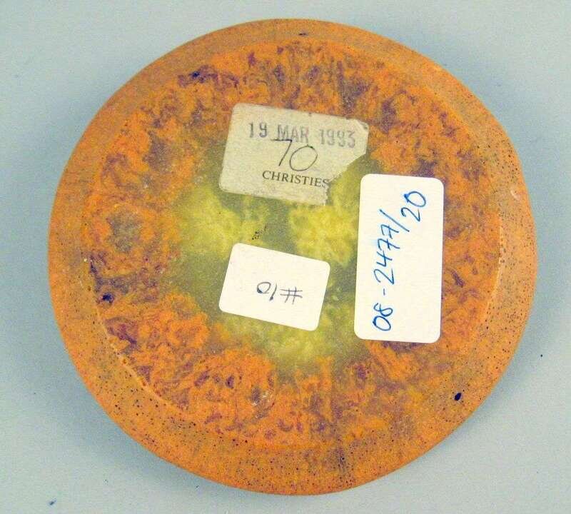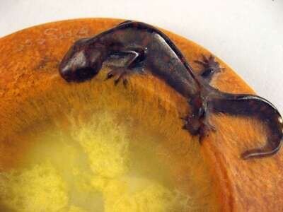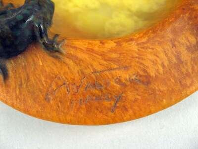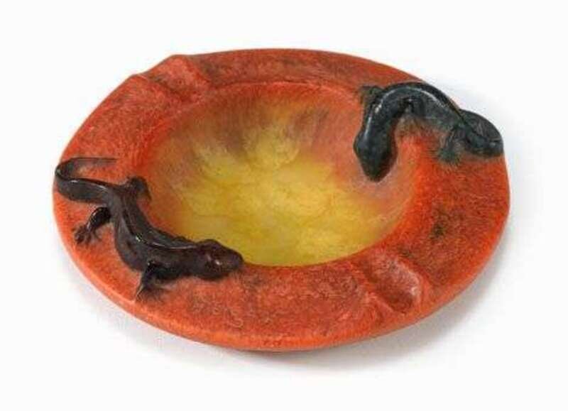 The molded orange to yellow tray with two salamanders on the rim, one green, the other red, molded 'A. Walter/ Nancy' signature.