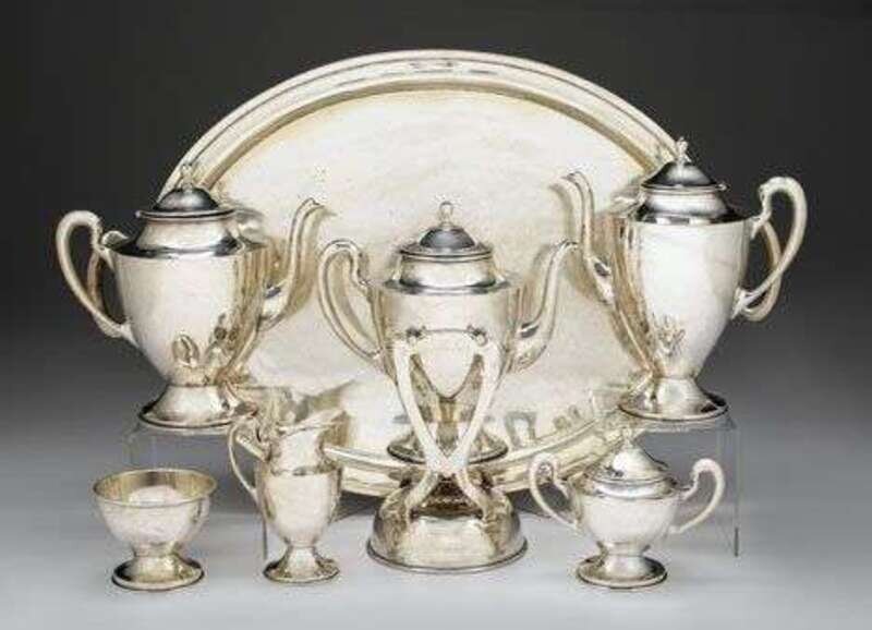 Of plain urn form, comprising a coffeepot, teapot, hot water kettle-on-stand, creamer, covered sugar bowl, waste bowl and a two handle oval tray, stamped 'Conquistador/ Sterling/ Mexico 950/1000'. (7).