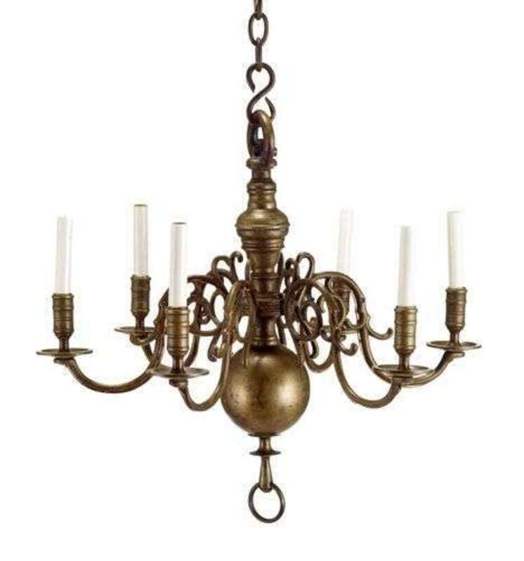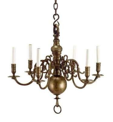 The central baluster stem issuing six scrolling candle arms, now fitted for electricity.