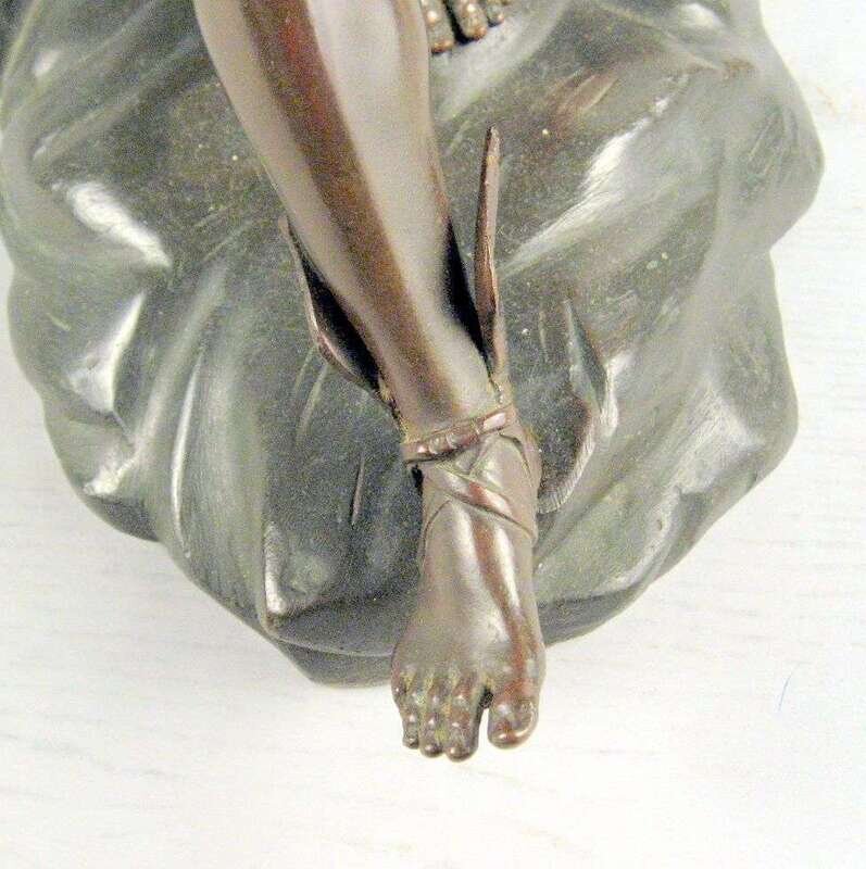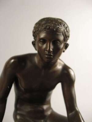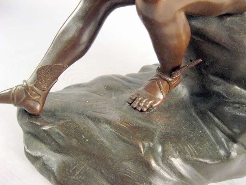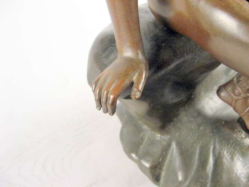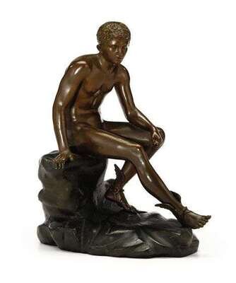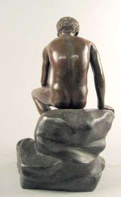 Bronze, orange brown patina, modeled as a nude classical figure seated on a rock.