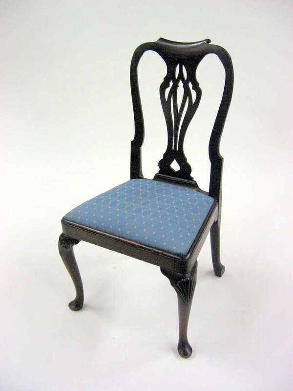With scrolled crest rail above a pierced splat, raised on cabriole legs with shell carved knees on pad feet.