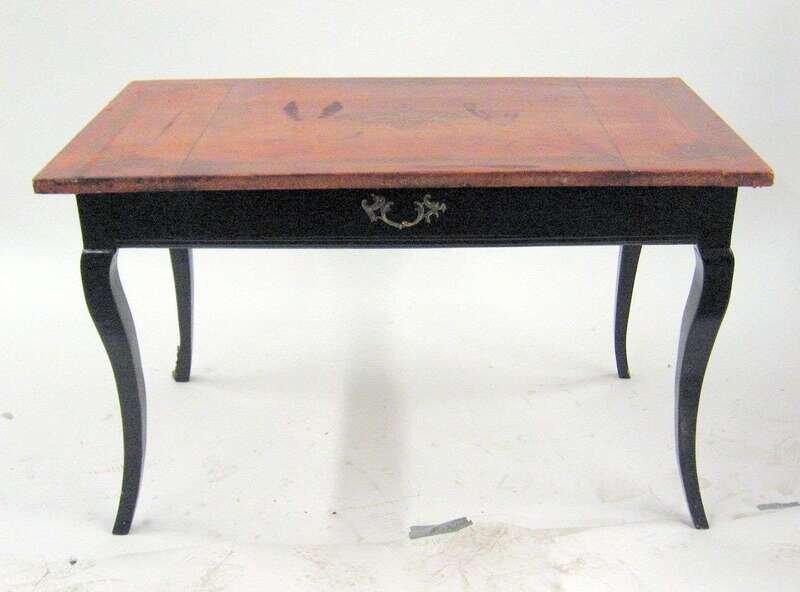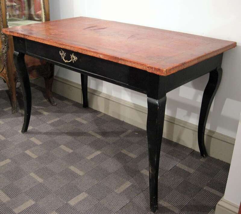 The rectangular gilt tooled red leather top above a central short drawer raised on cabriole legs ending in sabot.