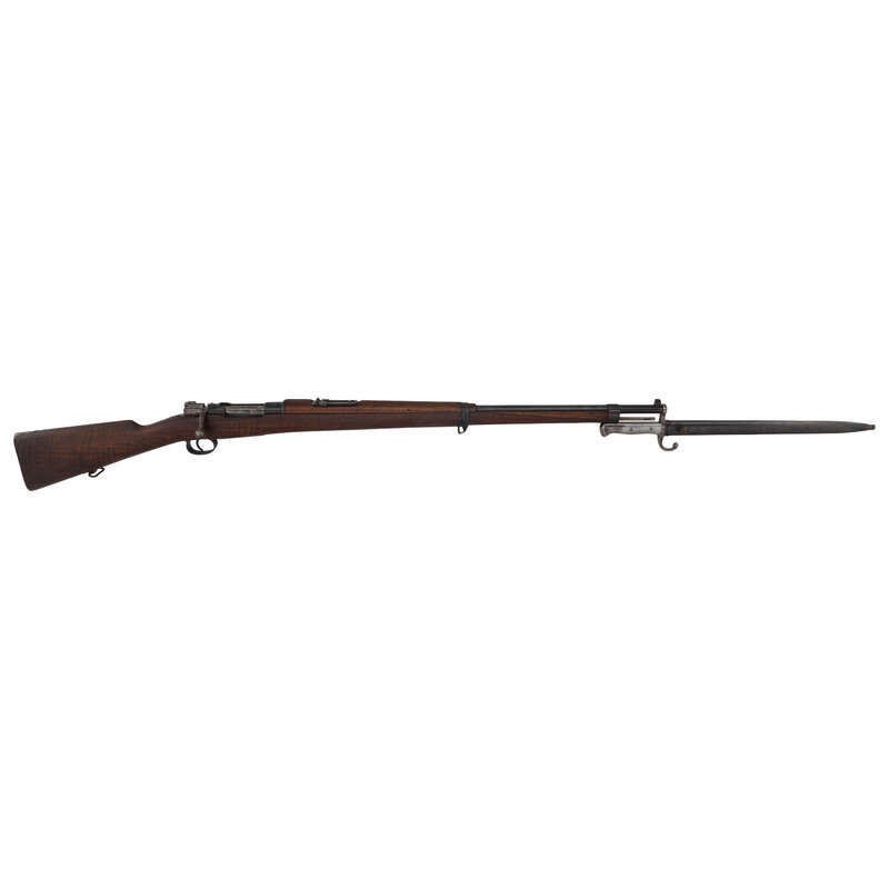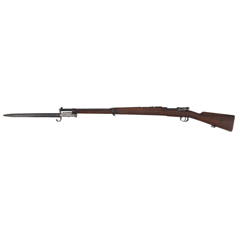 7x57mm Mauser. 29" barrel length. SN: D5760. Blued metal finish. Walnut stock has a plain straight grip and forearm, with handguard. Bolt action rifle with an adjustable folding ladder notch rear sight and blade front sight. Item features an internal magazine, double sling swivels, and bayonet lug forend. Serial number on bolt is non-matching. Includes slotted head cleaning rod and an aluminum grip Argentine M1891 bayonet with scabbard.