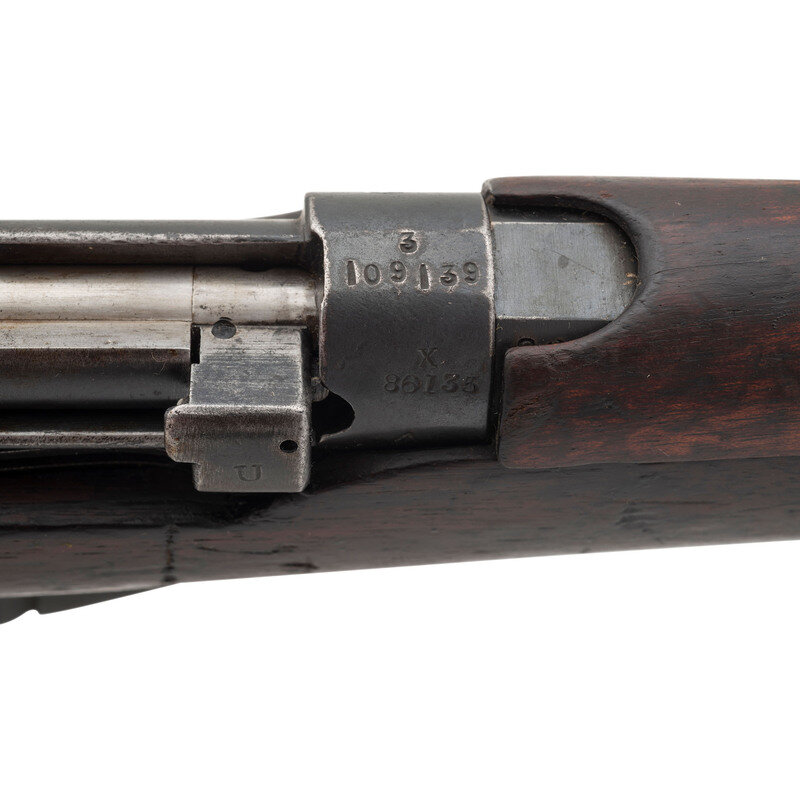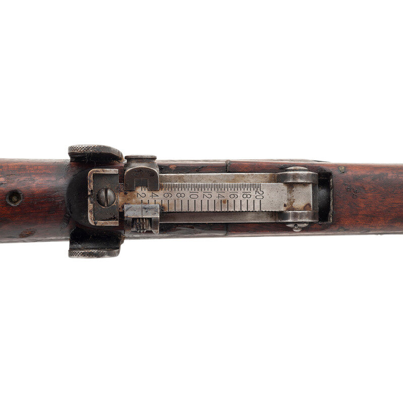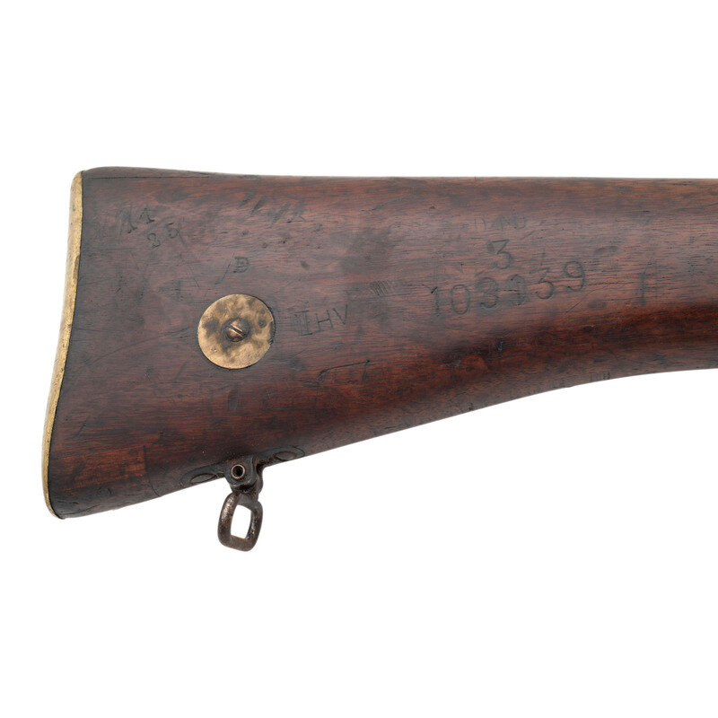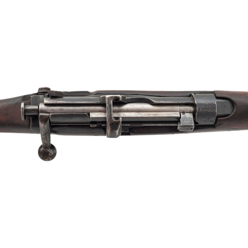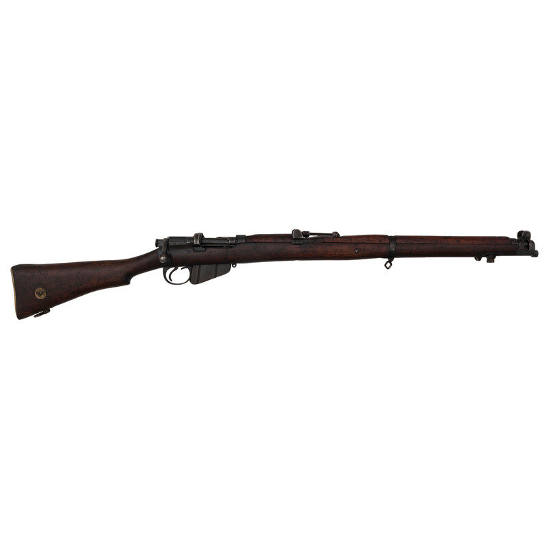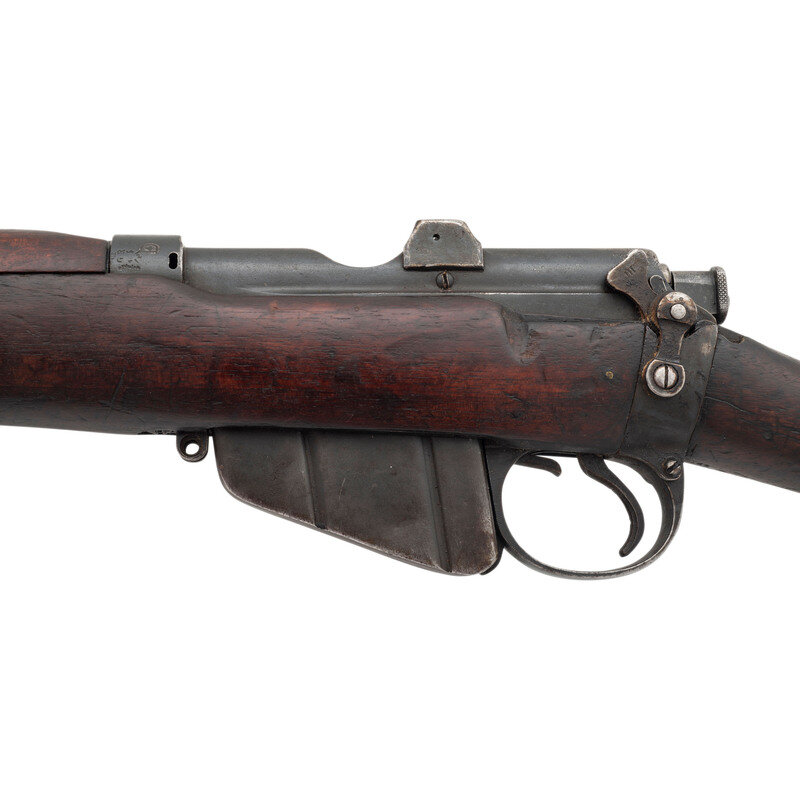 .303 British. 25" barrel length. SN: 3109139. Blued military finish. Full length walnut stock has plain grip and forearm, with full length handguards. Bolt action rifle with an adjustable tangent notch rear sight and blade front sight with ear protectors. Item features an integrated magazine, bayonet lug forend, double sling swivels, and a brass trapdoor buttplate void of contents. Volley sights appear to have been removed at some point. Markings include various British proofs overall to metal and wood stock, including {crown}/GR/B.S.A. Co/1915/Sht LE/III to wrist band and what appear to be JJCO importer marks on right side of receiver.