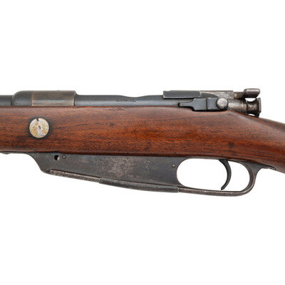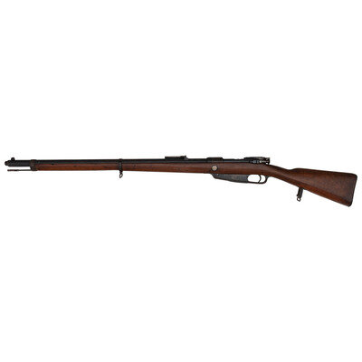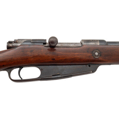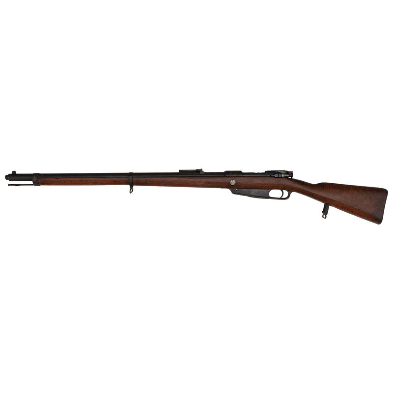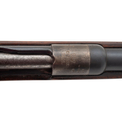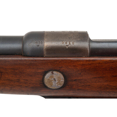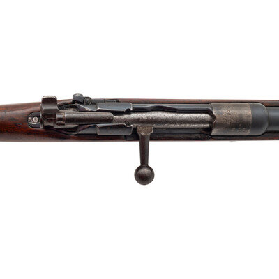 Patrone 88 (8mm). 29.5" barrel length. SN: 9410V. Blued military finish. Walnut stock has a plain straight grip and forearm with single barrel band. Bolt action rifle with adjustable folding ladder notch rear sight and blade front sight. Item features an integrated magazine, double sling swivels, bayonet lug on right side, and a slotted head cleaning rod. Markings include an 1891 date and roll marked S to receiver. Forend cap is marked 66.R.1.13. on left side, possibly regimental marks. Receiver has notch cut away to front, and stripper clip guides to rear indicating it was converted sometime after 1905.