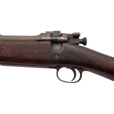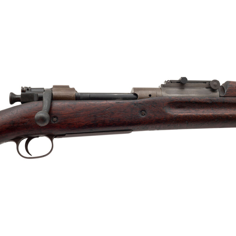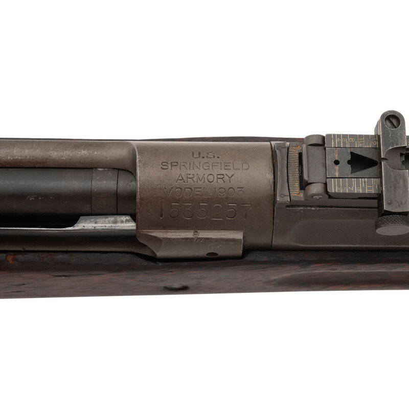 .30-06. 24" barrel length. SN: 1535257. Grey parkerized finish overall with black oxide finish to bolt. Walnut "S" stock has a plain straight grip and forearm, with humpback handguard and grasping grooves. Bolt action rifle with an adjustable folding ladder notch rear sight and blade front sight. Item features an internal box magazine, triple stacking sling swivels, bayonet lug forend, and a trapdoor buttplate void of contents. Markings include U.S./SPRINGFIELD/ARMORY/MODEL 1903/1535257 to receiver, and what appears to be an erred SA/{flaming bomb}/12 41- marking to top of barrel behind front sight. Hyphen appears to be stamped after the 41 date rather than before. Stock is marked with a boxed RIA/FK Rock Island Arsenal Frack Krack rebuild inspector cartouche, another faint obscured boxed cartouche, and wrist marked with circle P proof.