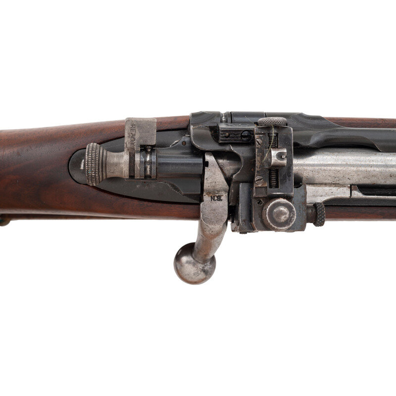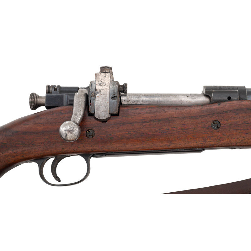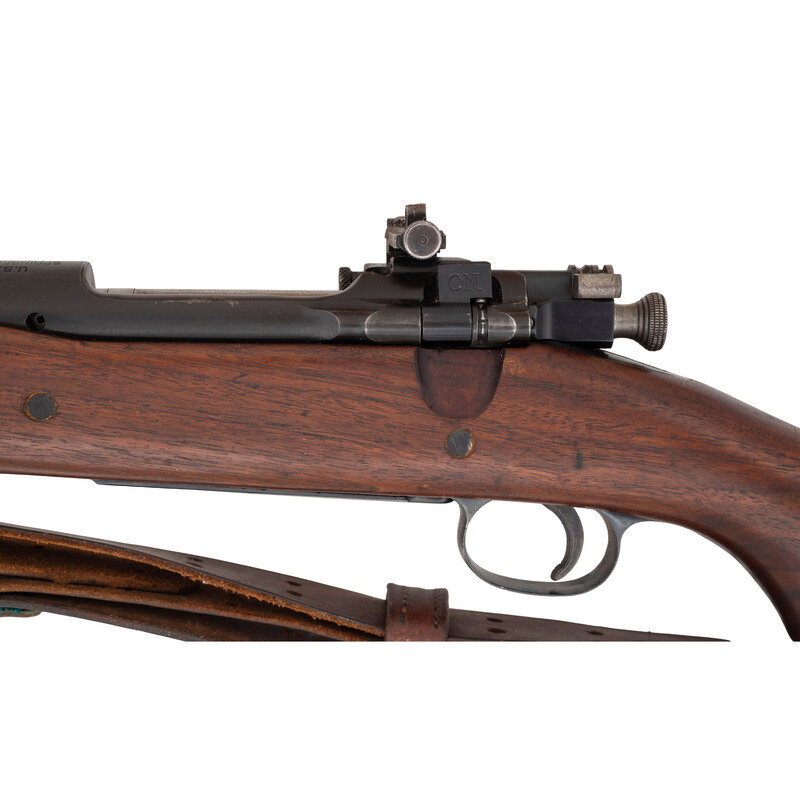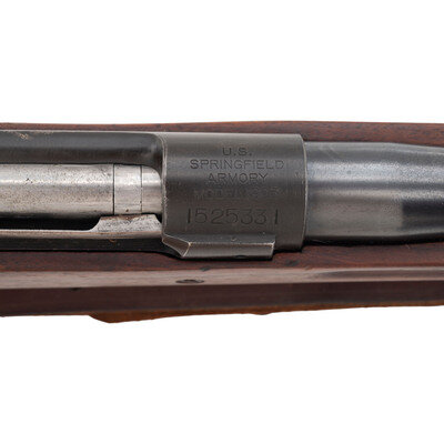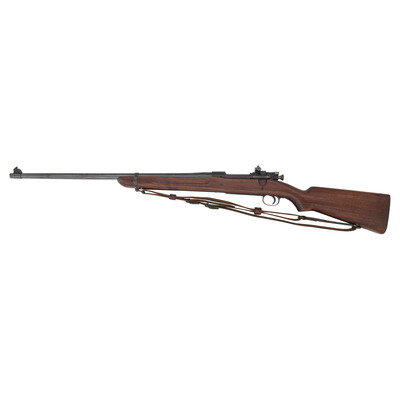 .30-06. 24" barrel. SN: 1525331 (mfg. ca.1938-39). Blued and Parkerized finish, two-bolt C-style half stock with finger grooves. Bolt action fixed magazine fed target rifle with Lyman adjustable peep rear sight and blade front sight and sling swivels. Receiver marked in five lines: U.S./SPRINGFIELD/ARMORY/MODEL 1903 over the serial number. Barrel marked SA/{Flaming Bomb}/5-38 with a * star gauge at the 6-o'clock location on the face of the muzzle. The top of the bolt handle is marked NS but is not serial numbered to the gun. The bottom flat of the pistol grip is marked M2 and the toe-line of the stock is stamped D28225. A US 1905 leather sling is included with the rifle.