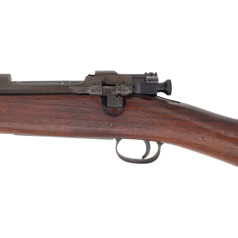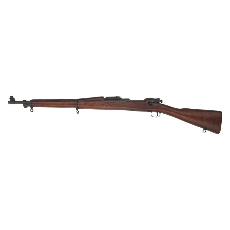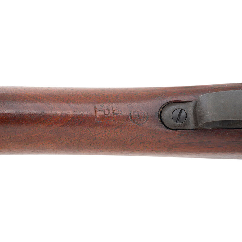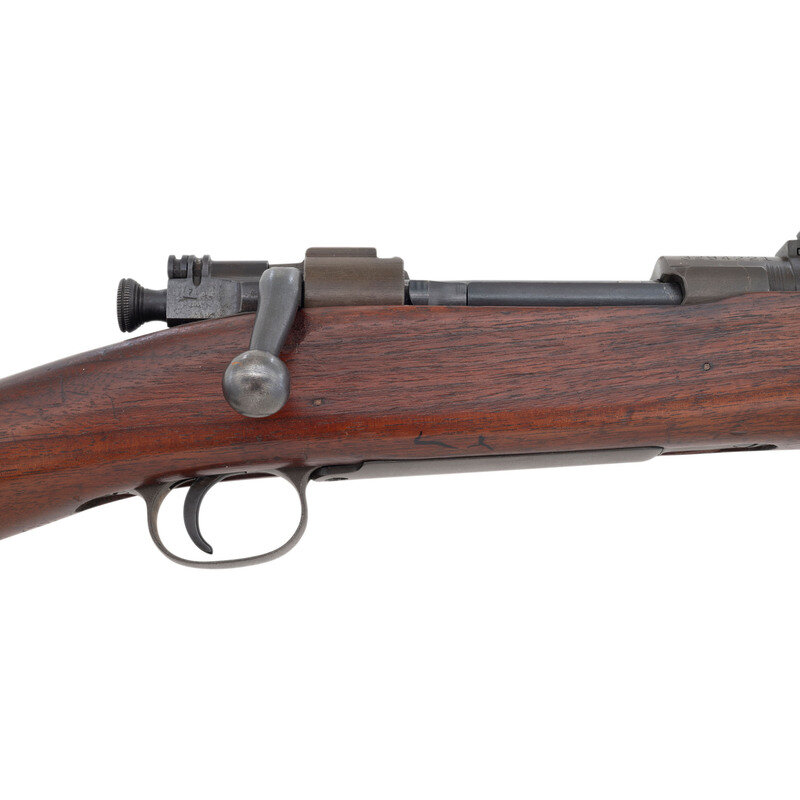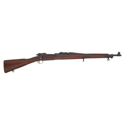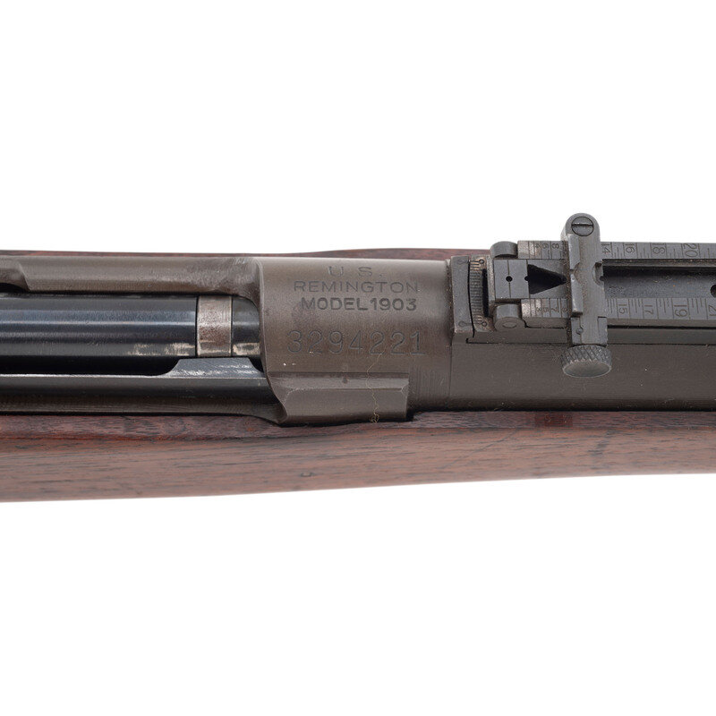 .30-06. 24" barrel. SN: 3294221. Parkerized finish, blued bolt and sight protector, straight grip S-stock without reinforcement bolts or grasping grooves. Bolt action, stripper clip fed, fixed magazine battle rifle with adjustable leaf rear sight and fixed front sight blade, sling and stacking swivels. Chamber with standard Remington markings and serial number, Remington barrel dated 11-42. Counterpane with weak boxed FJA (Frank J Atwood) cartouche, as well as weak C-SAA San Antonio Arsenal rebuild mark. Both the original and rebuilt "P" proofs, one in a circle and one boxed, are present behind the triggerguard along with a 6.