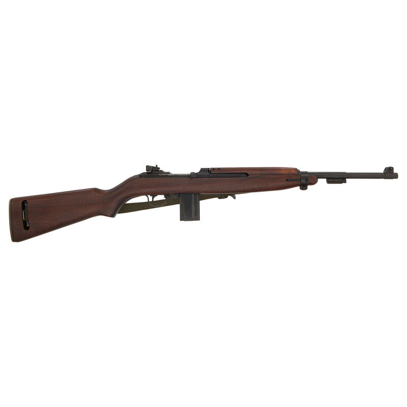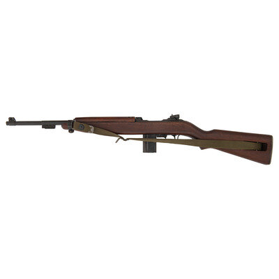 .30 Carbine. 18" barrel. SN: 4251150. Parkerized finish, low wood oval cut walnut stock and four-rivet handguard. Rebuilt semi-automatic magazine fed military carbine with Type III adjustable rear sight and Type III barrel band with bayonet lug. Receiver with NATIONAL/POSTAL METER marking and serial number, barrel marked SA 11-51. Throat erosion measures 2, muzzle erosion measures 2.5. Includes a single MN marked 15-round magazine, an OD green web sling and an oiler.