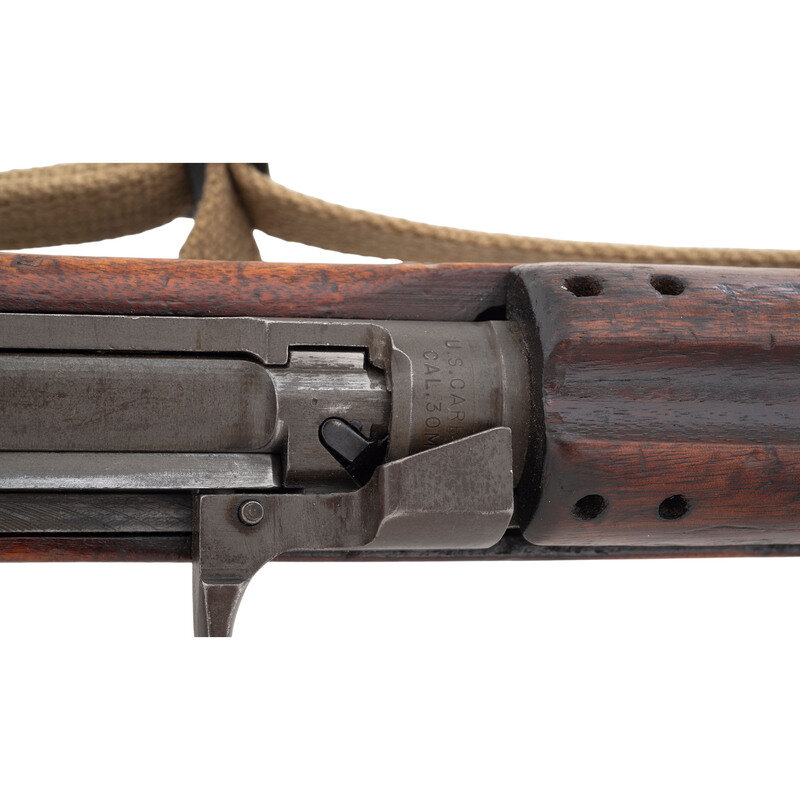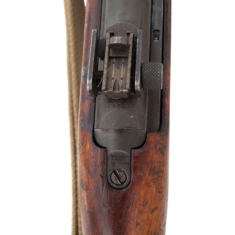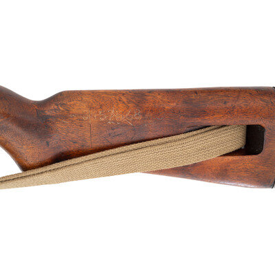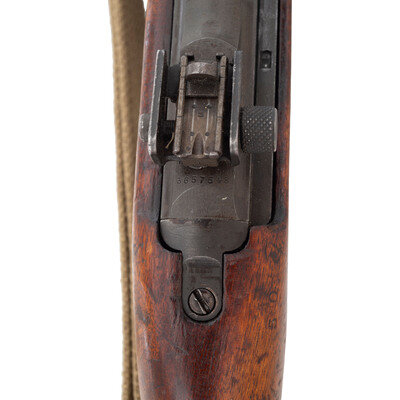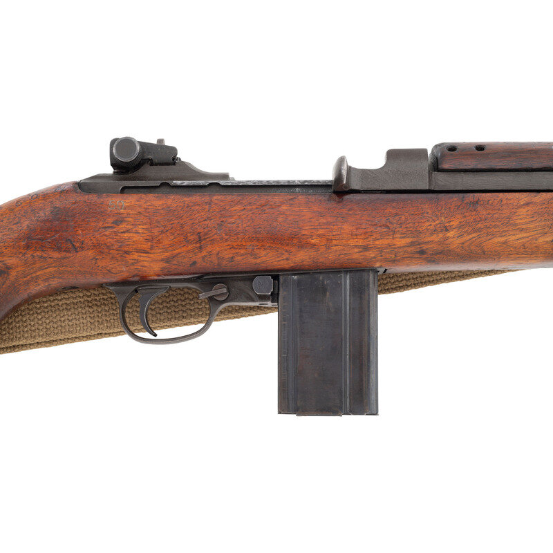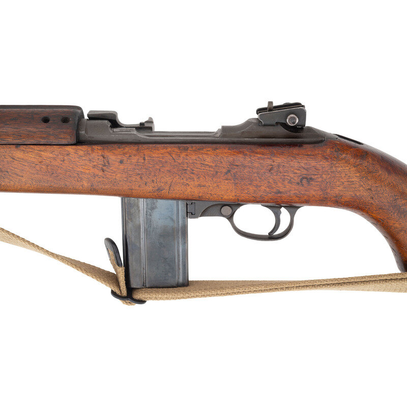 .30 Carbine. 18" barrel. SN: 3657548. Parkerized finish, low wood walnut stock. Rebuilt semi-automatic magazine fed military carbine with Type III adjustable rear sight and Type III barrel band with bayonet lug. Receiver with IBM CORP marking and serial number, barrel marked IBM CORP/8-43/{Flaming Bomb}, stock with serial number of receiver stamped on the reverse. Barrel import marked by C.A.I. forward of the bayonet lug. Throat erosion measures 1, muzzle erosion measures 3. Includes a single UN marked 15-round magazine, an OD green web sling and an oiler.