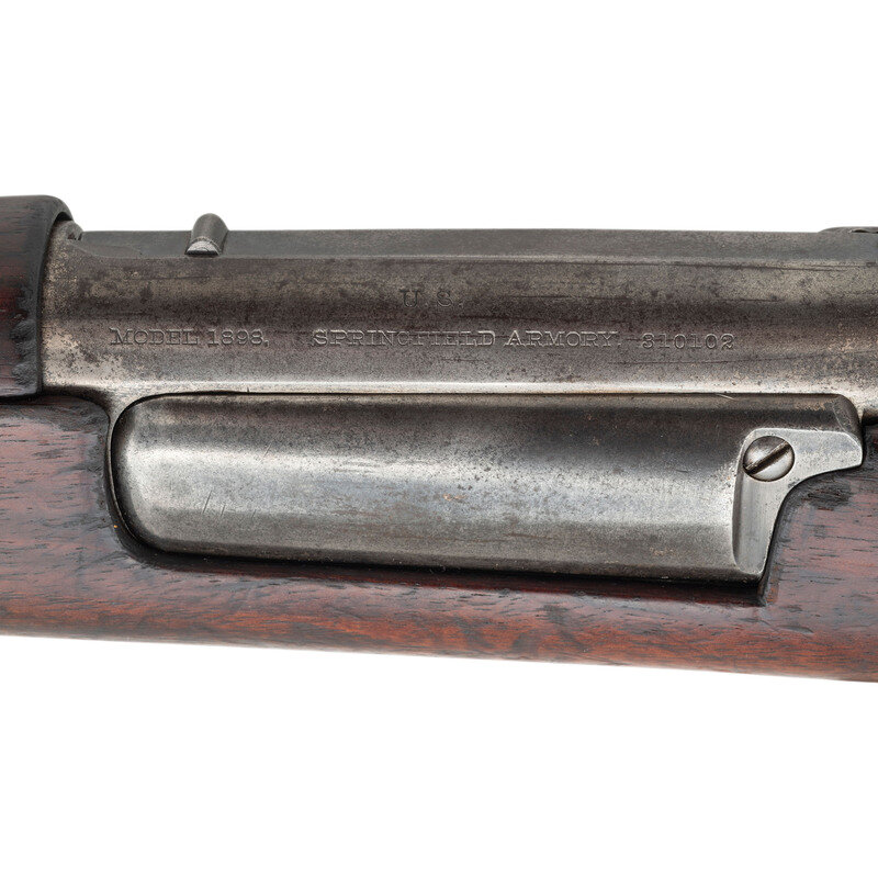 .30-40 Krag. 30" barrel length. SN: 310102. Blued and case hardened finishes. Walnut stock has a plain straight grip and forearm, with hand grooves, single barrel band, and four rivet handguard. Bolt action rifle with an M1901 adjustable folding ladder notch rear sight and pinned blade front sight. Item features an integrated 5-shot magazine, bayonet lug forend, triple stacking swivels, and a trapdoor buttplate void of contents. Markings include U.S./MODEL 1898 SPRINGFIELD ARMORY followed by serial number to receiver. Stock is marked with a boxed JSA/1907 Joseph S. Adams inspector cartouche and a circle P proof to bottom of grip.