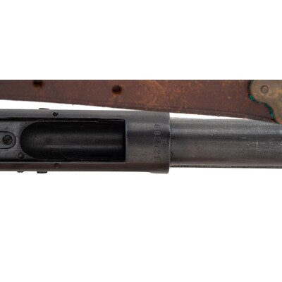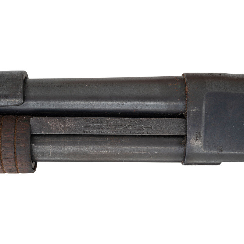 12 Gauge. 20.375" barrel length. SN: E682721. 2.75" chamber length. Cylinder choke. Blued metal finish overall set in a walnut semi-pistol grip stock with corncob forend and combination four-row perforated heat shield and bayonet lug. Slide action solid frame repeating shotgun fed by an internal tube magazine and mounting a front bead sight in addition to sling swivels on the toe and bayonet lug. The action bar shows the model marking MODEL 1897/-WINCHESTER-/TRADE MARK REG. IN U.S. PAT. OFF. with Winchester monogram proof marking on the top of the barrel and upper left cylinder. Address marking to barrel includes patent dates up to 1910 followed by the 12 GA. caliber marking. Left side of the bayonet lug is marked PAT. JAN. 15 & MAR. 19. 1918. Serial number falls outside of the range for World War I and World War II trench guns, and the firearm displays no martial markings of any kind. Comes with a pattern of 1907 sling.