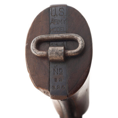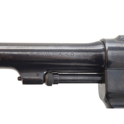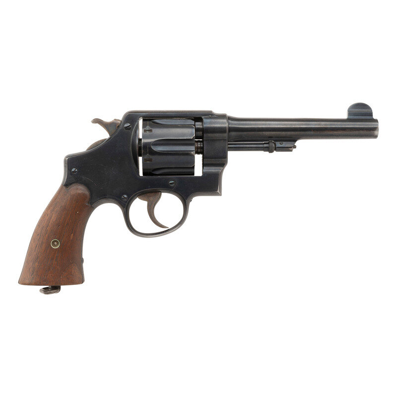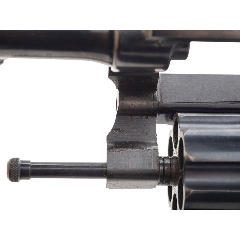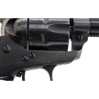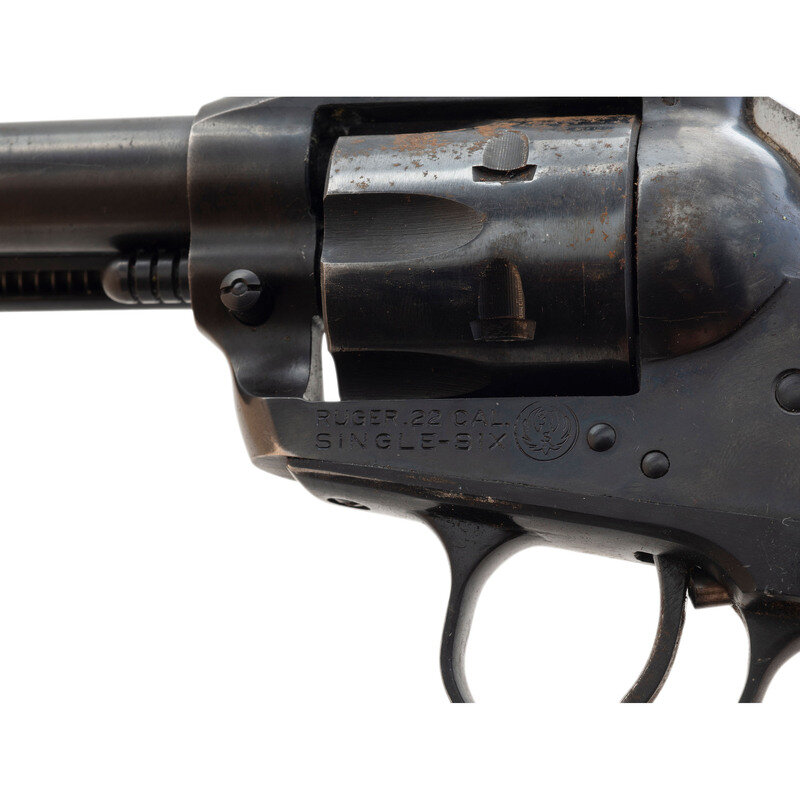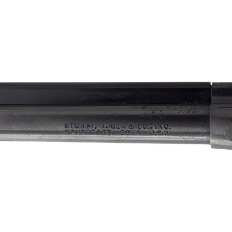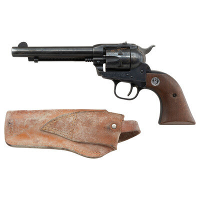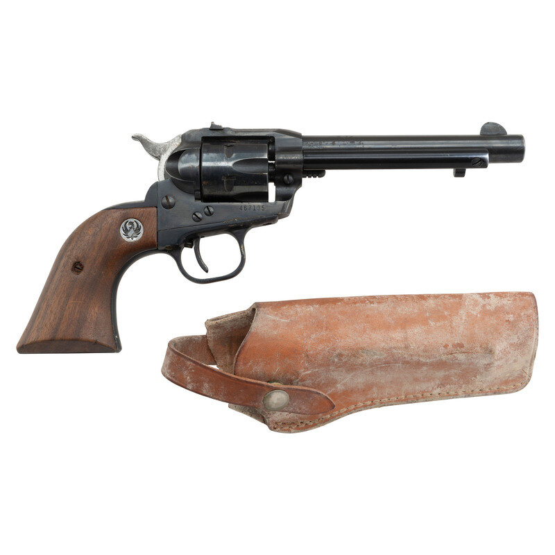 .22 LR. 5.5" barrel length. SN: 467135. Blued metal finish with black anodized ejector rod housing and gripstraps with walnut Ruger medallion grips. Single action six-shot loading gate revolver with flat-top topstrap with rear notch and matted front blade sights. Revolver shows standard model marking to the left frame and two-line Ruger address to the top barrel without the later Warning marking. Additionally, the revolver lacks the later transfer bar safety. Comes with a leather BIANCHI marked holster.