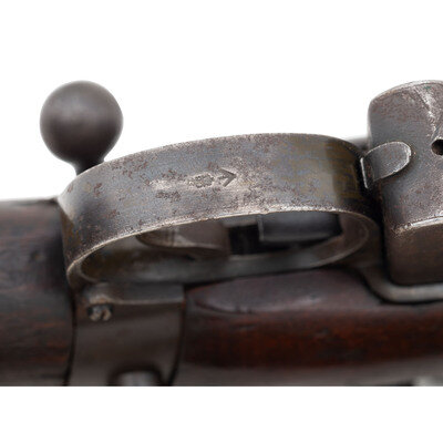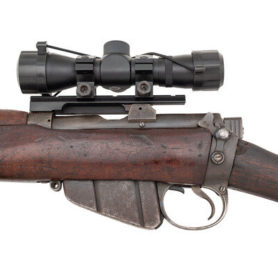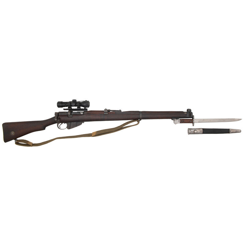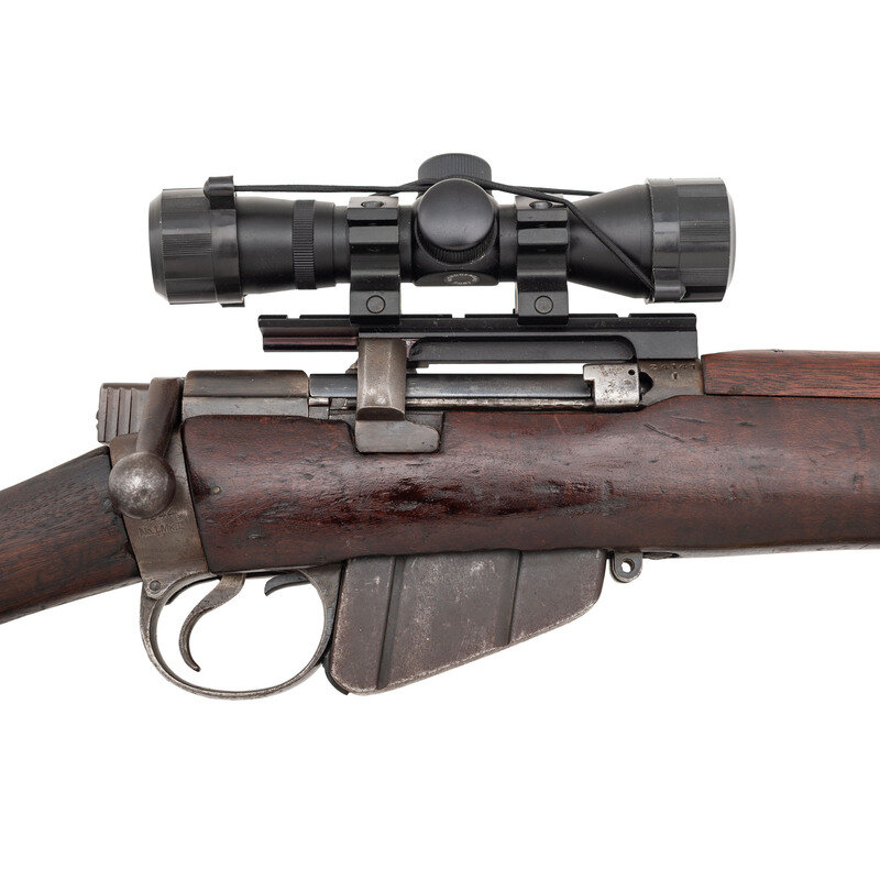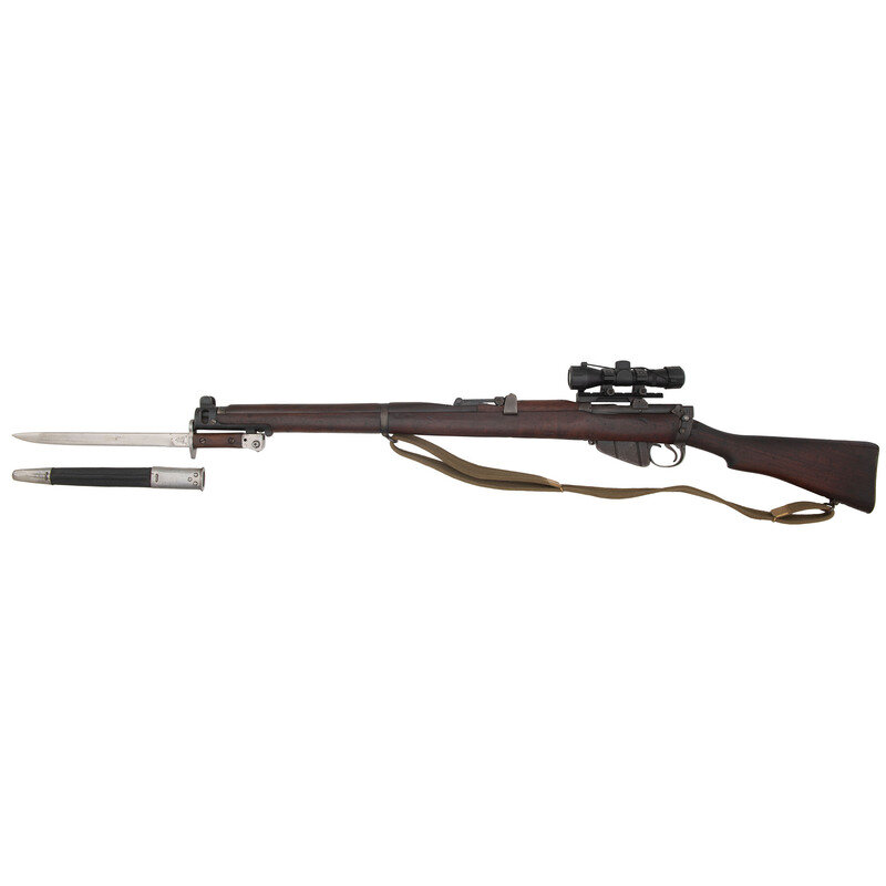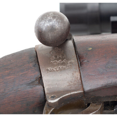 .303. 25.2" barrel length. SN: 241411. Blued metal finish overall set in a walnut two-piece stock mounting front blade and aperture rear sights with protectors. Bolt-action repeating rifle fed by a semi-detachable ten-shot magazine and featuring a cock on close action. Right side of the stock socket is marked {Crown}/G.R.I./1944/No.1.MkIII*. Rifle displays scattered {Broad Arrow} markings and a matching serial number to the bolt. Stock serial number does not match. Rifle has been fitted with an aftermarket Weaver scope rail mounting a 4X30 telescopic sight with turret protectors and lens caps, and no visible manufacturer mark. Comes with a blade bayonet with leather scabbard featuring G.R.I/MKII marking and standard British manufacture markings.