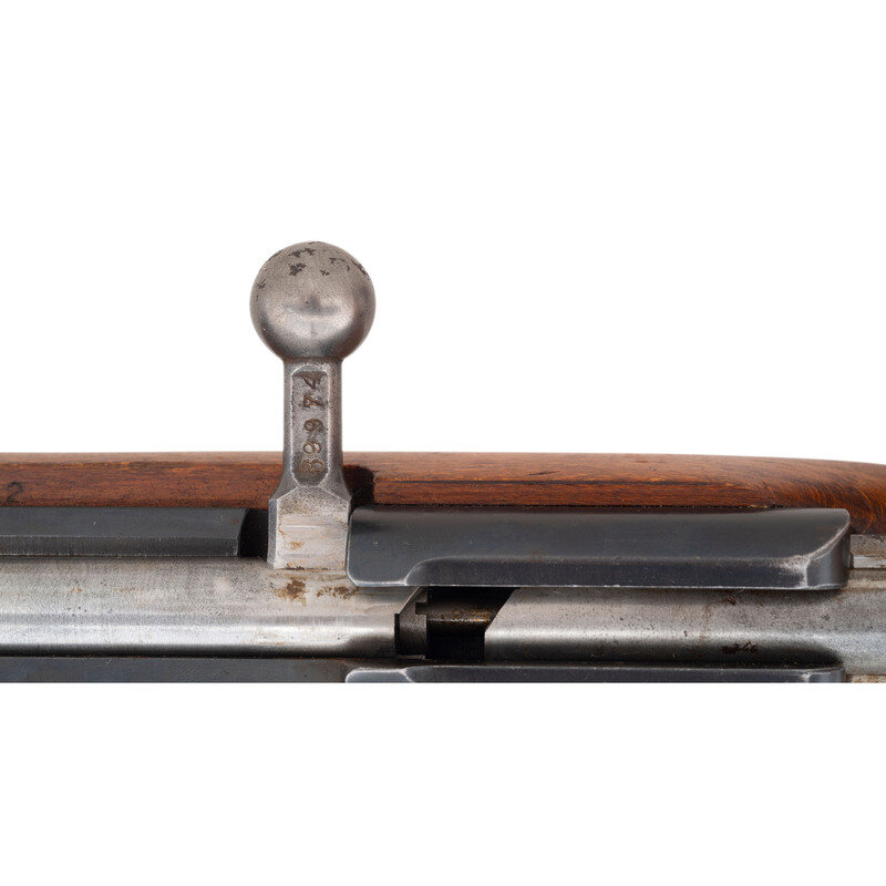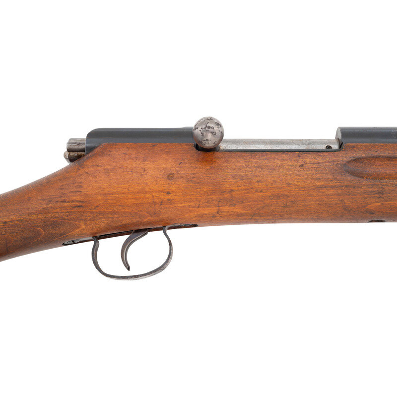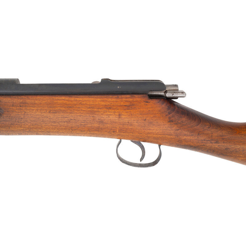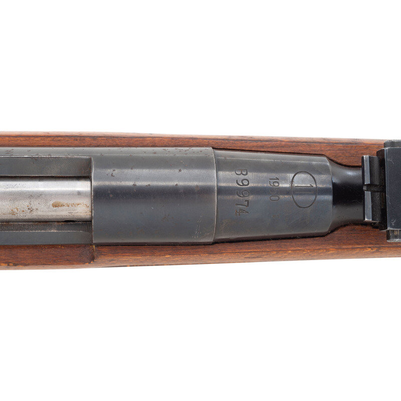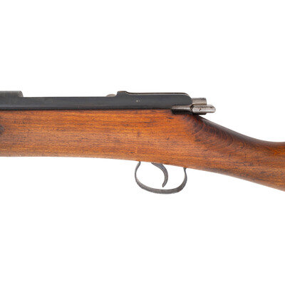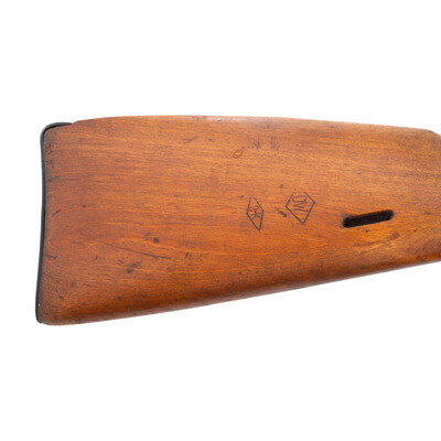 .22 LR. 24.75" barrel length. SN: B9974. Blued metal finish, with polished bolt. Hardwood stock has a plain straight grip and forearm, with handguard and grasping grooves. Single shot bolt action rifle with adjustable tangent notch rear sight, globe post front sight, sling slots, and a steel buttplate. Receiver is marked with Radom {circle 11}/1950 marks. Barrel has importer marks. Stock has diamond OW and diamond 2-K cartouches to right side.