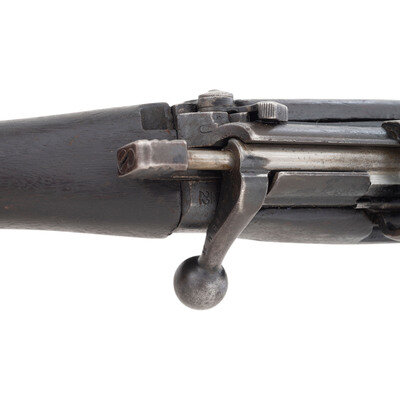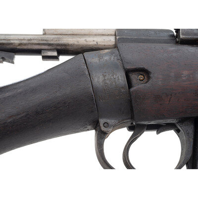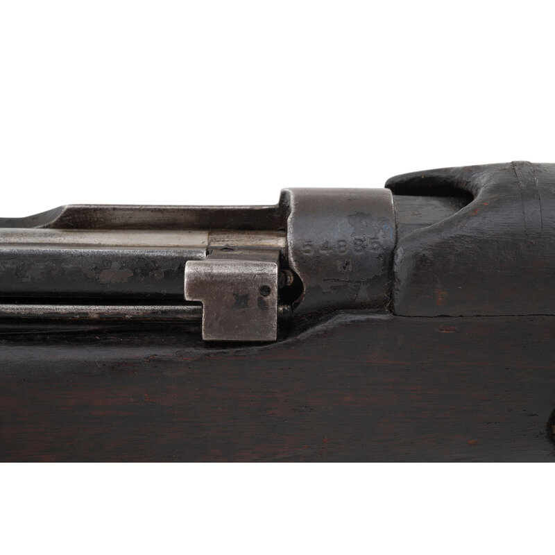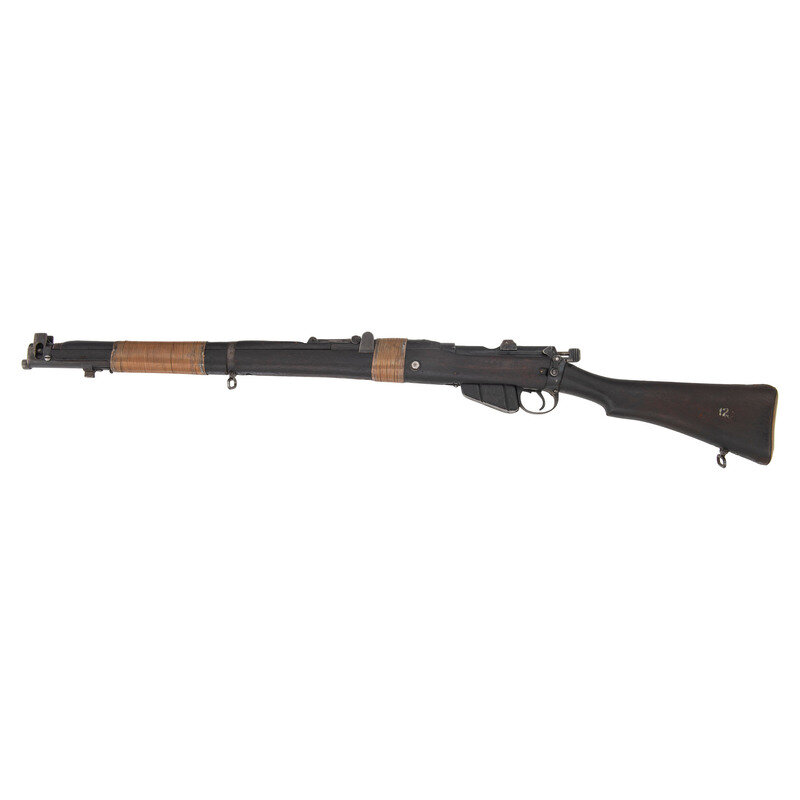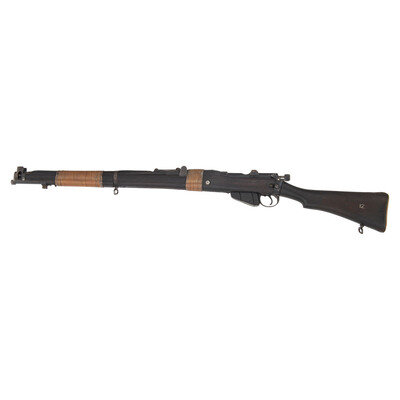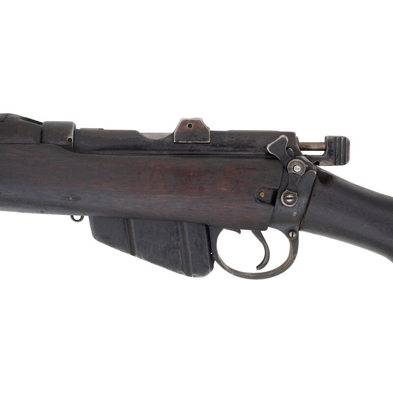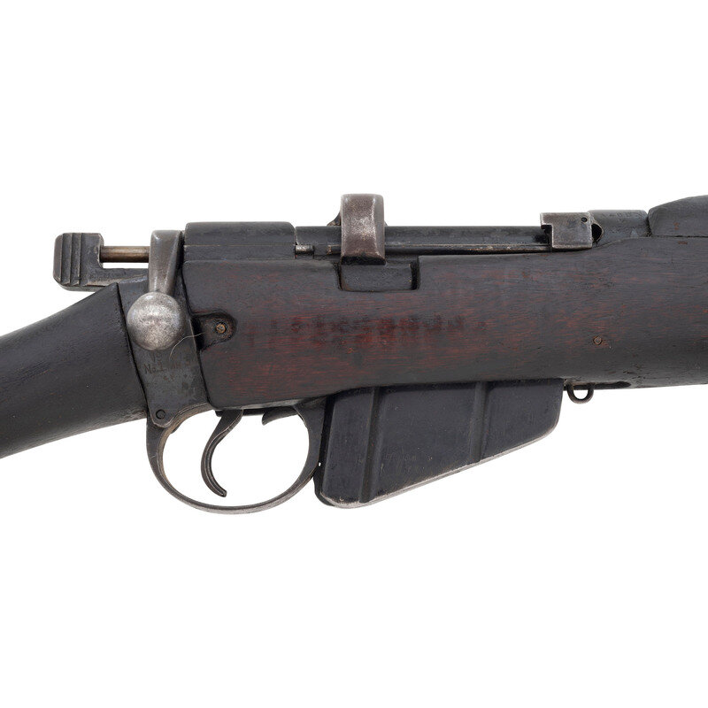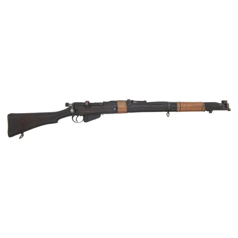 .303 British. 25" barrel length. SN: 54885. Blued military finish. Walnut stock has a plain semi pistol grip and forearm, with wire wrapping and handguard. Bolt action rifle with adjustable tangent notch rear sight and blade front sight with ear protectors. Item features a bayonet lug forend, double sling swivels, an integrated magazine, and trapdoor brass buttplate void of contents. Wrist band is marked RFI/1953. Stock is painted 12 on left side of butt.