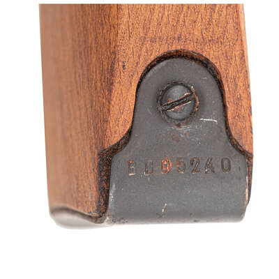7.62x54mmR. 20.2" barrel length. SN: AB20338. Blued metal finish with polished bolt set in a straight wrist wood stock with side folding cruciform spike bayonet mounting standard adjustable rear notch and fully hooded front post sights. Bolt action repeating rifle fed by an internal box magazine accompanied by canvas sling and steel cleaning rod. Top of the receiver shows the circled 11 marking indicating it was manufactured in the Radom Munitions Factory followed by a date marking of 1953. Serial numbers match on the receiver, bolt, and magazine floorplate, but the buttplate number does not match. Item shows scattered arsenal markings including H and MO within diamonds on the right stock, and further diamond stamps on the metal components. Sling is stamped with U3 within a diamond beside a further faint and illegible stamp.