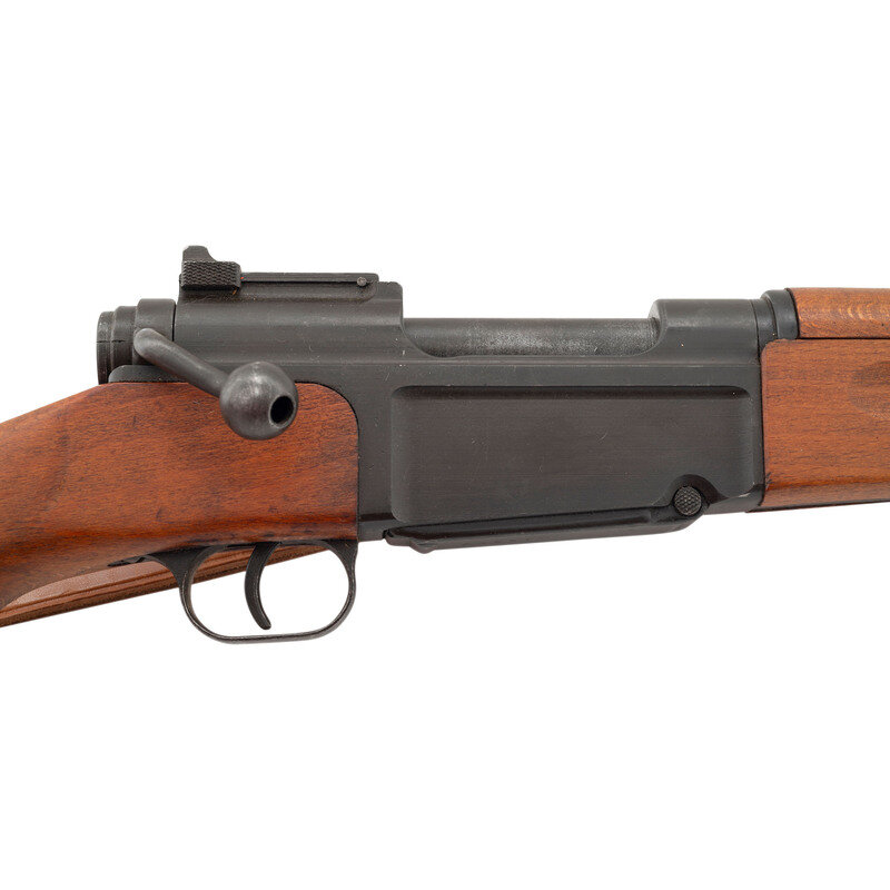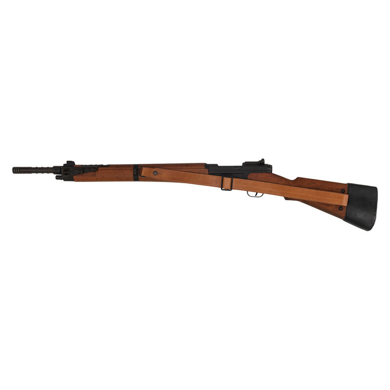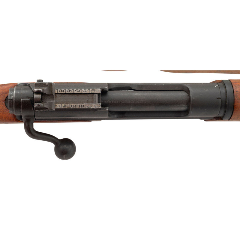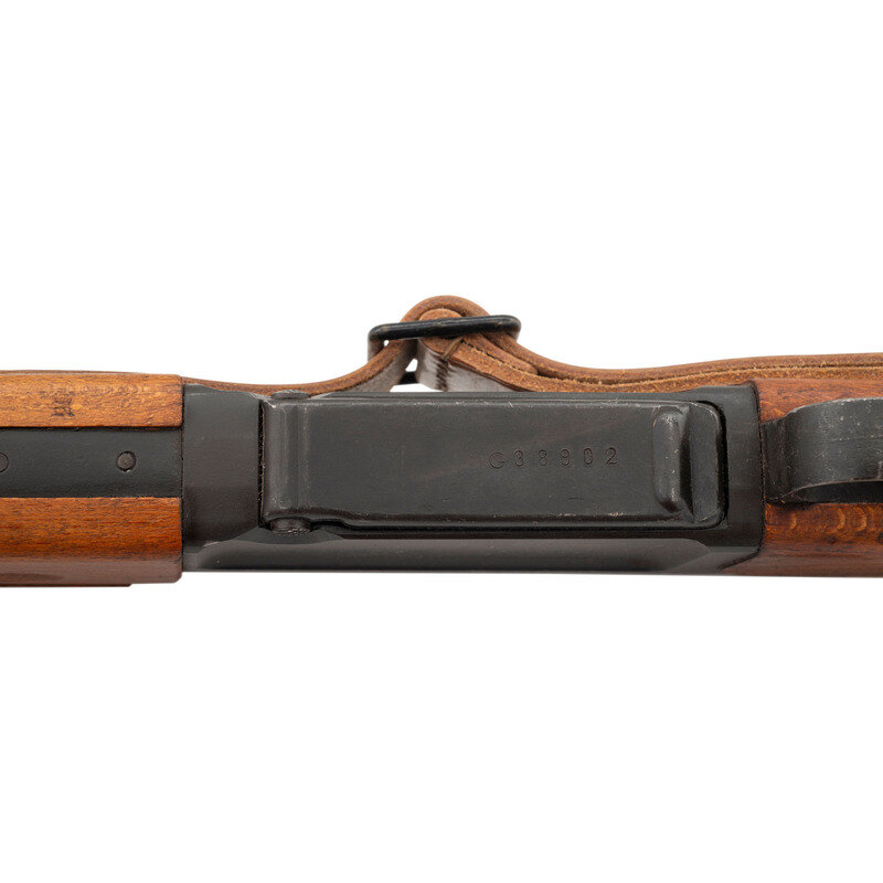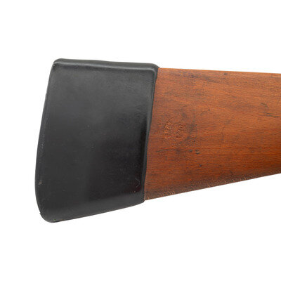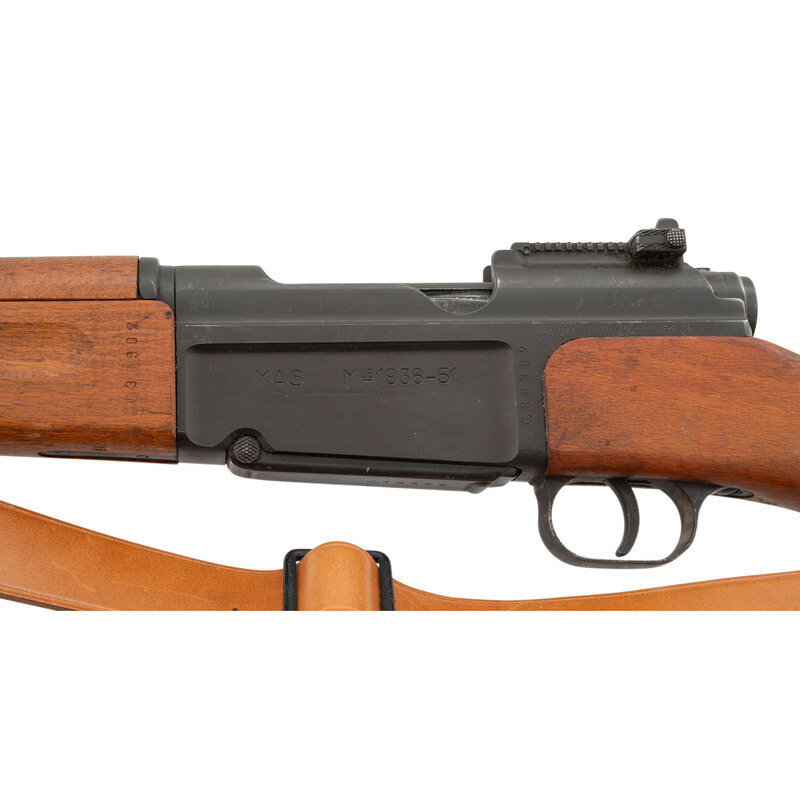 7.5x54mm MAS. 24.25" barrel length. SN: G38902. Parkerized military finish. Two piece walnut stock has a plain semi pistol grip and forearm, with handuard and single barrel band. Bolt action rifle with adjustable folding peep rear sight, blade front sight with ear protectors, and 22mm NATO rifle grenade launcher sights. Item features an internal box magazine, rubber MAS 51 slip on recoil pad, bayonet, and sling swivels. Includes brown leather sling.