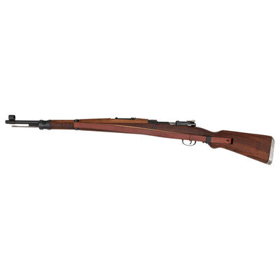 7.92x57mm Mauser. 23.25" barrel length. SN: M98612. Blued metal finish. Walnut stock has a plain straight grip and forearm, with handguard. Bolt action rifle with an adjustable tangent notch rear sight and hooded blade front sight. Item features a bayonet lug forend, internal magazine, sling, and steel buttplate. Handguard possibly replaced at some point.