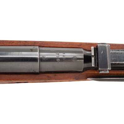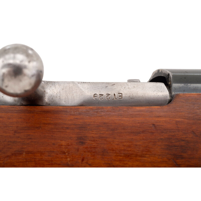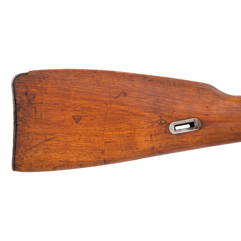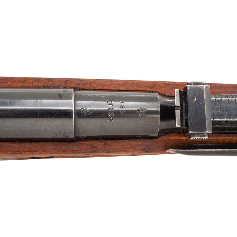 7.62x54mmR. 20.2" barrel length. SN: ET229. Blued metal finish with polished bolt set in a straight wrist Birchwood stock with full length upper handguard and side-folding cruciform spike bayonet. Bolt-action repeating rifle fed by an internal box magazine mounting standard adjustable rear notch and fully hooded front post sights. Barrel shank displays the [RPR} emblem of the "Romanian People's Republic" followed by a date of 1954. Serial number marks match where observed, and the rifle features scattered Romanian inspection marks.