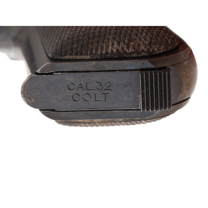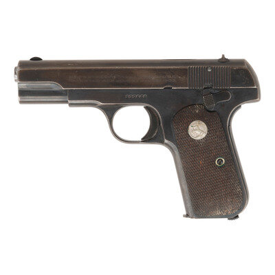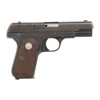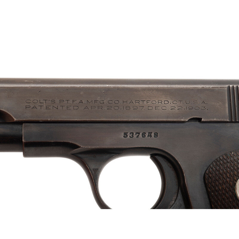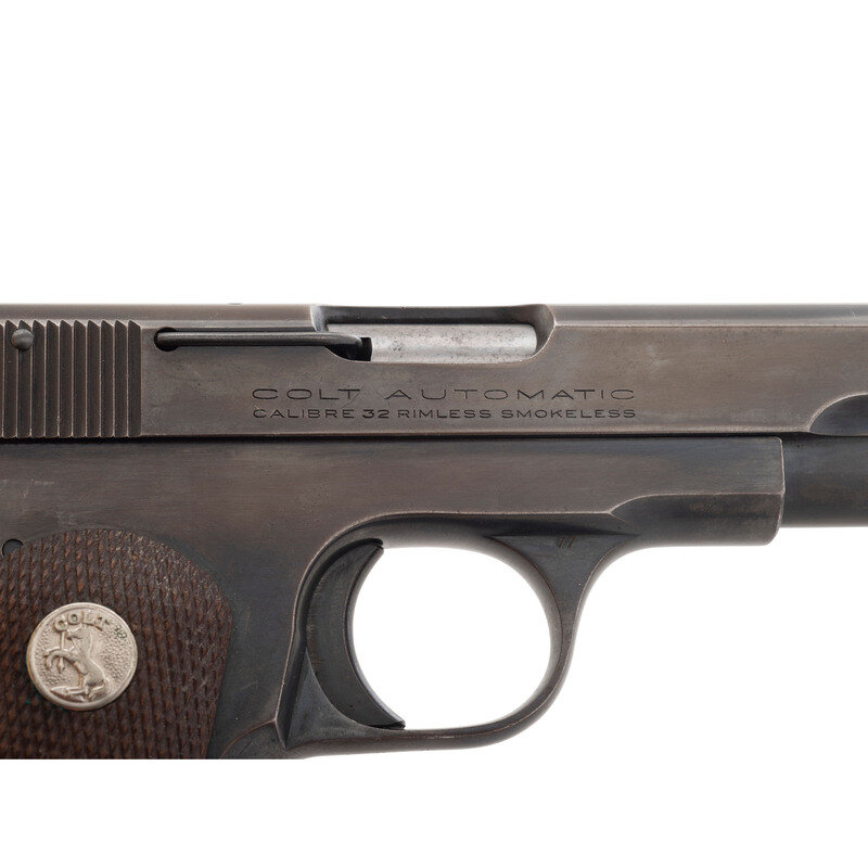 .32 ACP. 3.75" barrel length. SN: 537648. Blued metal finish with checkered walnut Colt medallion grips and fixed sights. Single-action internal hammer fired simple blowback operated autoloading pistol fed by detachable single stack magazines. Item features a heel magazine release, thumb actuated safety lever, and a grip safety mechanism. Slide is marked COLT AUTOMATIC/CALIBRE 32 RIMLESS SMOKELESS to the right and COLT'S PT. F.A. MFG. CO. HARTFORD, CT. U.S.A./PATENTED APR. 20, 1897. DEC. 22, 1903. Item features a magazine safety indicating it to be a Type V. Comes with one magazine.