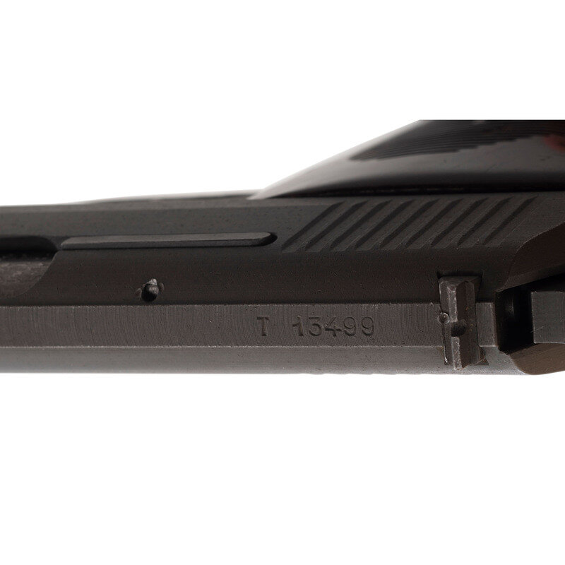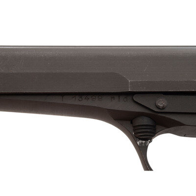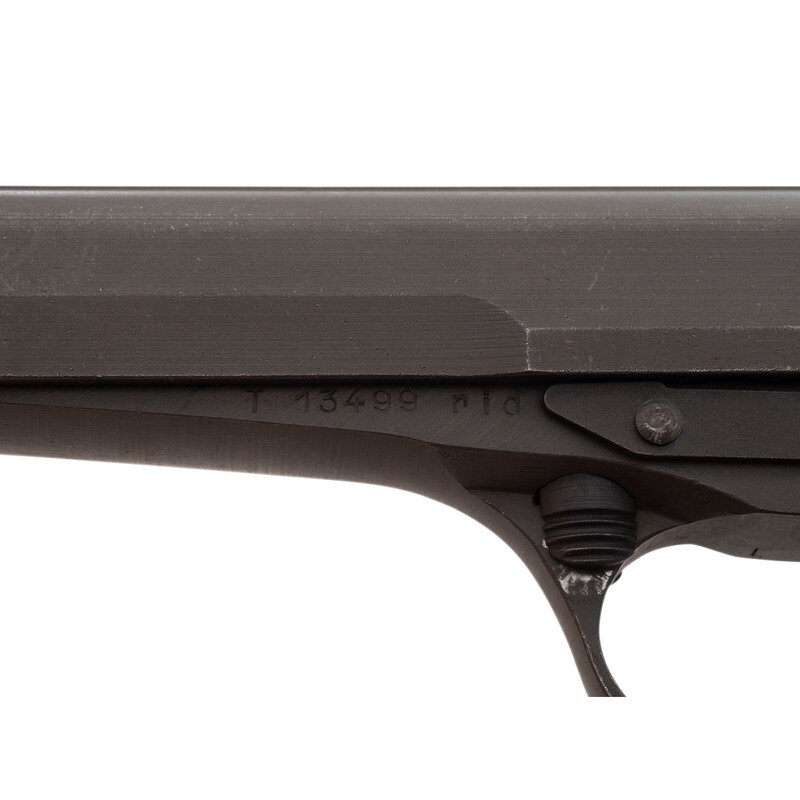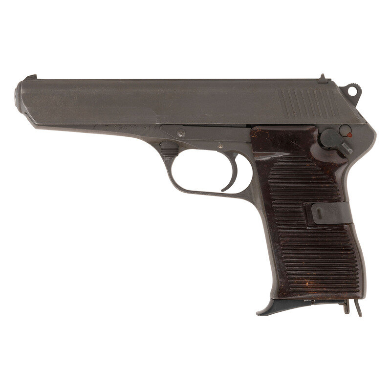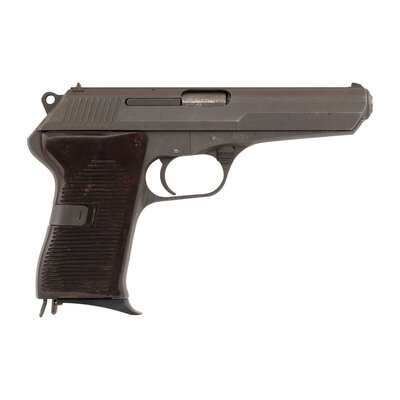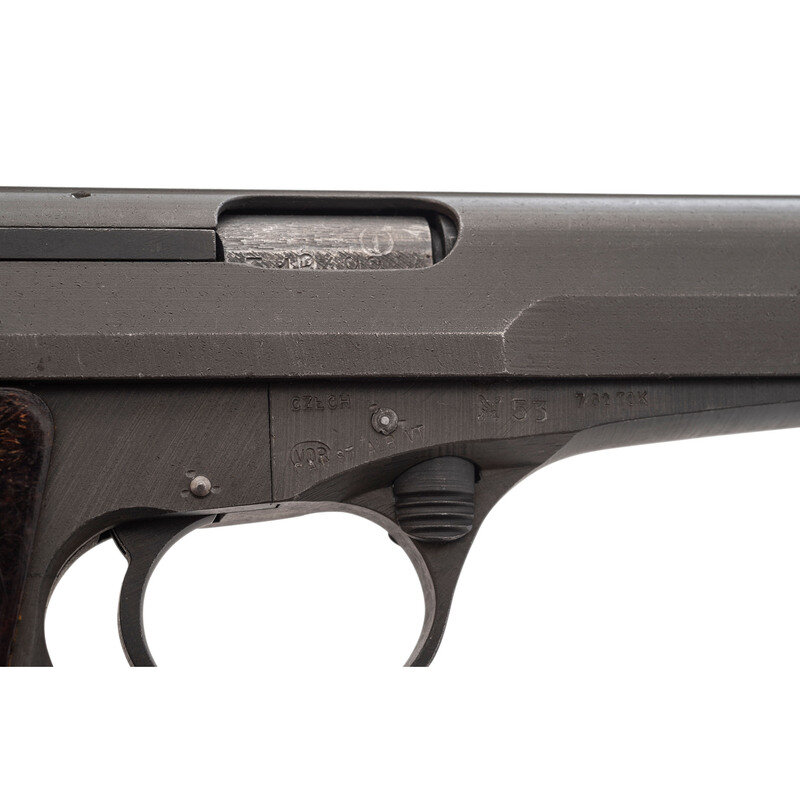 7.62x25mm. 4.7" barrel length. SN: T13499. Parkerized metal finish overall with brown synthetic grip panels and military pattern iron sights. Roller delayed blowback single-action autoloading pistol fed by detachable single stack magazines. Item shows matching serial number markings on the slide, frame, and barrel, along with the Czech {Crossed Swords} military acceptance mark beside a date of 53 for 1953. Serial number marking is followed by standard Czech rid marking. Importer marks to the right frame read CZECH/CAI ST ALB VT. Comes with one synthetic floorplate magazine.