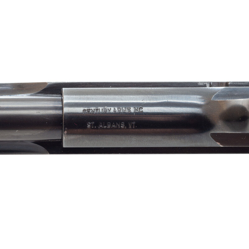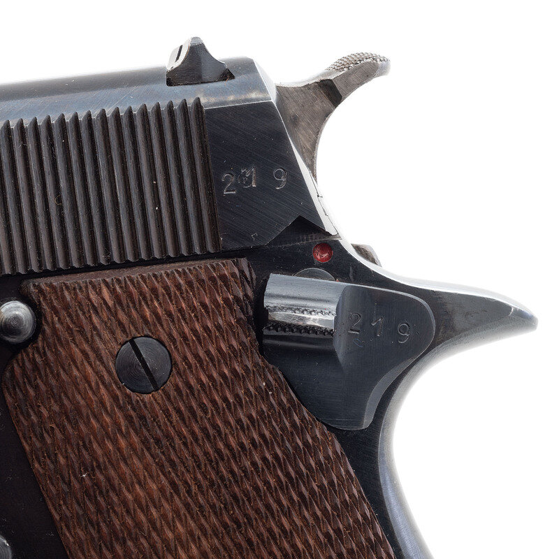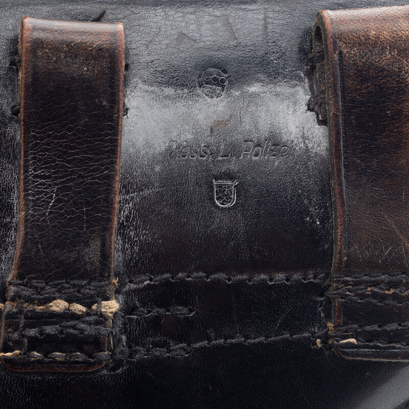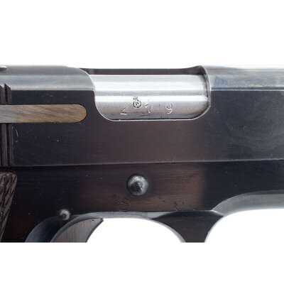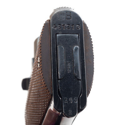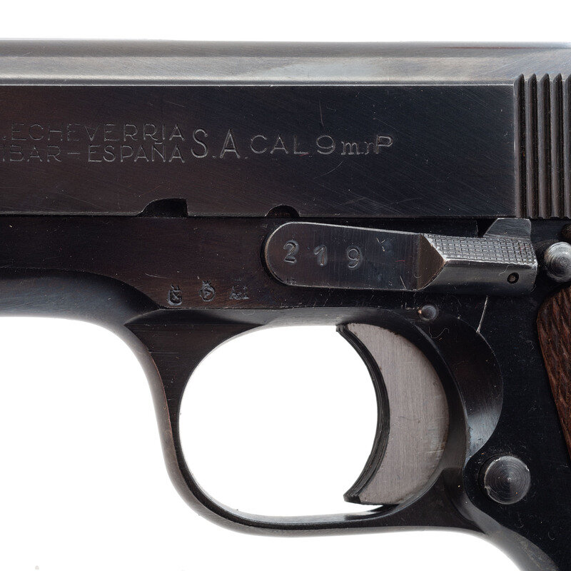 9mm Para. 4.8" barrel length. SN: 481219. Blued metal finish overall with straw colored small parts mounting checkered walnut stocks and military pattern sights. Short recoil operated single action autoloading pistol fed by detachable single stack magazines. Left slide is struck with the {Star Logo} followed by STAR B. ECHEVERRIA/EIBAR-ESPANA S.A. CAL 9mP with the P marking over-stamping one of the two m's in the caliber marking. Underside of the frame shows the importer marking CENTURY ARMS NC/ST. ALBANS. VT. Butt is struck B beside {Rampant Lion} marking. The right breech is struck by {Bomb P} proof marking with three further proofs struck into the left frame. Final three digits of the serial number struck in the left slide, barrel bushing, right breech, safety lever, slide stop, and magazine floorplate with the latter followed by the number 2. The interior slide is marked with roman numerals XIX and XI. Front sight has been painted white. Item comes with a single magazine and a black leather holster showing an eco maker mark above Hess. L. Polizei and a {Rampant Lion} stamp.