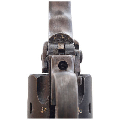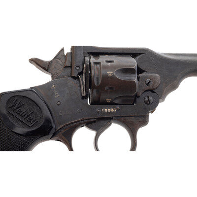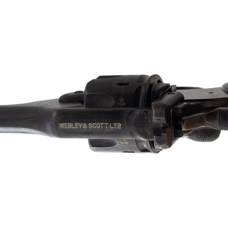 .38 S&W. 5" barrel length. SN: 88947. Rough black finish with appropriate WAR FINISH mark on left frame and mounting Webley logo black synthetic grips. Double action top-break auto-ejector revolver with six shot cylinder. Sights consist of a forged front blade made in one piece with the barrel, and a latch rear notch. Model mark along the left topstrap reads MARK IV .38 with the right frame displaying the ENGLAND export marking. The topstrap is struck with the manufacturer marking WEBLEY & SCOTT LTC. Item shows British military broad arrow markings with {Crown/BNP} Birmingham proofs visible on all major components, including each chamber. Left barrel is struck with pressure proof data, and the butt is fitted with a lanyard loop. External finish displays the rough tool marks typical of war finished examples of the Mark IV Webley. Comes with a khaki canvas holster with brass snap showing maker marking UNITED CARR/CANADA. Holster is otherwise unmarked and has a tied own only and no flap.