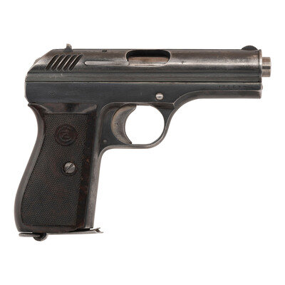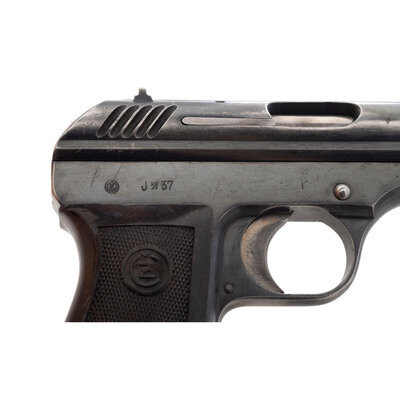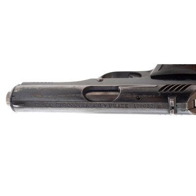 .380 ACP. 3.56" barrel length. SN: 166632. Blued metal finish with straw colored hammer and trigger mounting checkered brown synthetic CZ logo grips. Single-action short-recoil operated autoloading pistol fed by detachable single-stack magazines. Top of the slide displays maker marking CESKA ZBROJOVKA A.S. v PRAZE followed by the serial number and {Czech Rampant Lion}. Further markings on the right frame include the CZ monogram followed by J{Czech Lion}37 acceptance and date mark for 1937. A further lion proof mark is visible on the barrel. Serial numbers match on the frame, slide, and barrel. Comes with one unmarked magazine.