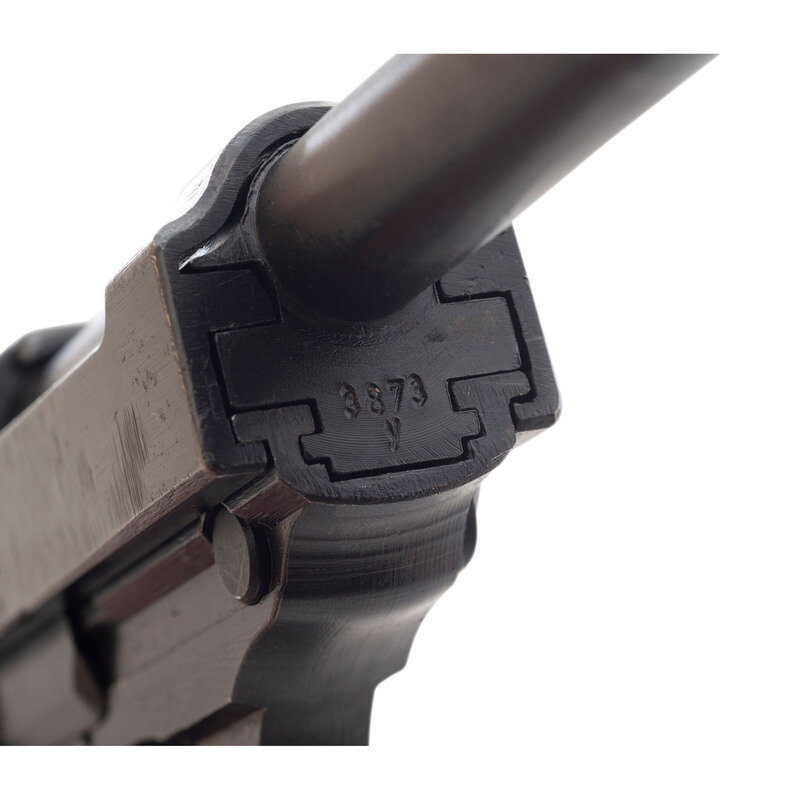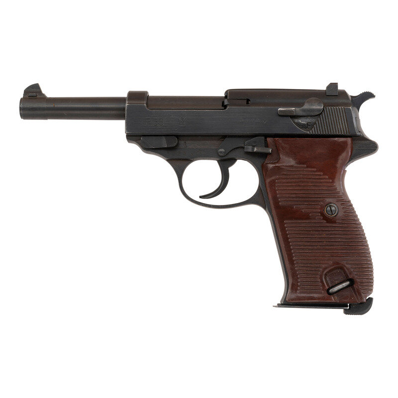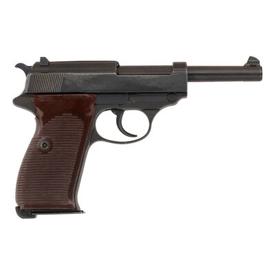 9mm Para. 4.9" barrel length. SN: 3873y. Soviet arsenal reblued finish overall mounting brown synthetic stocks. Short recoil operated DA/SA autoloading pistol fed by detachable single stack magazines. Left slide is struck with the P.38 model marking followed by byf factory code indicating the handgun was manufactured by the Mauser factory. Waffenampt markings on the right slide were removed during refinish. Further markings include {Eagle/WaA135} Waffenampt marking to the left frame, left barrel, and right locking block. WWII German Eagle acceptance proof markings remain on the left barrel and locking block. Serial numbers match on all major components. The left frame shows an X marking typical of Soviet captured firearms, along with a dark dipped blue finish common to Soviet arsenal refinished arms. An importer mark in the rear frame reads NHM CO/SACCA/9MM GERMANY. Comes with an unmarked magazine that features a roughly cut replacement floorplate that projects forward of the butt when inserted fully.