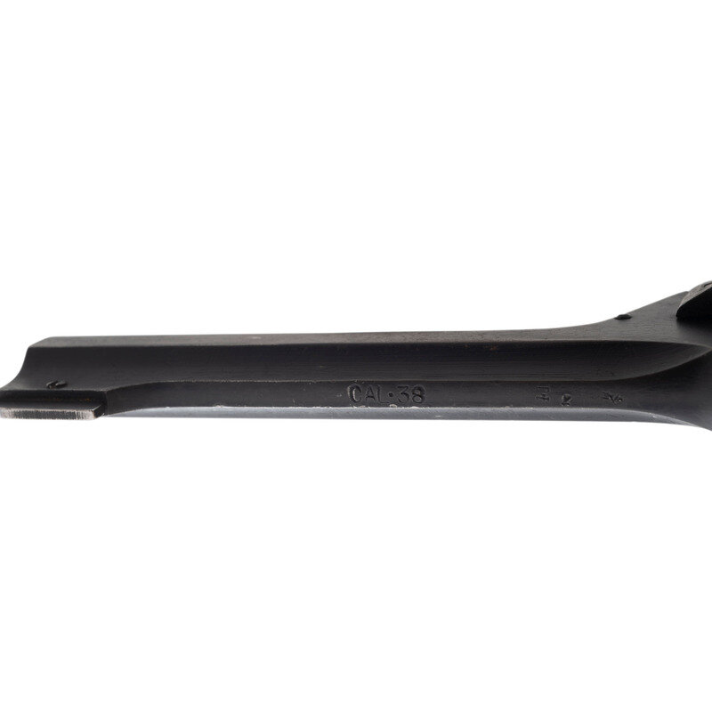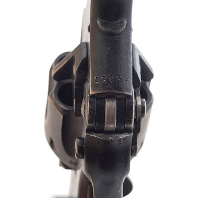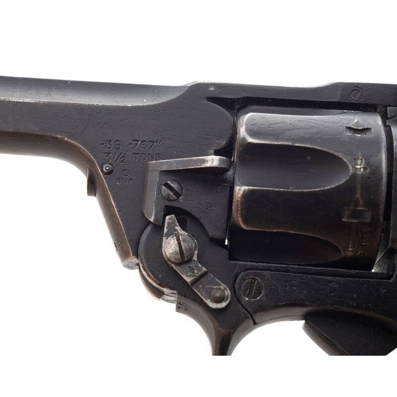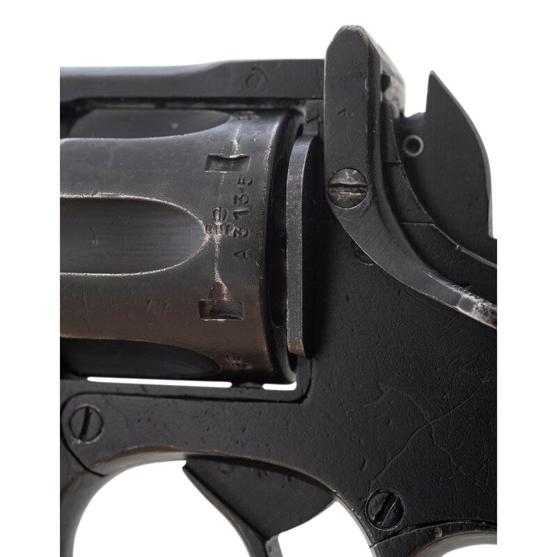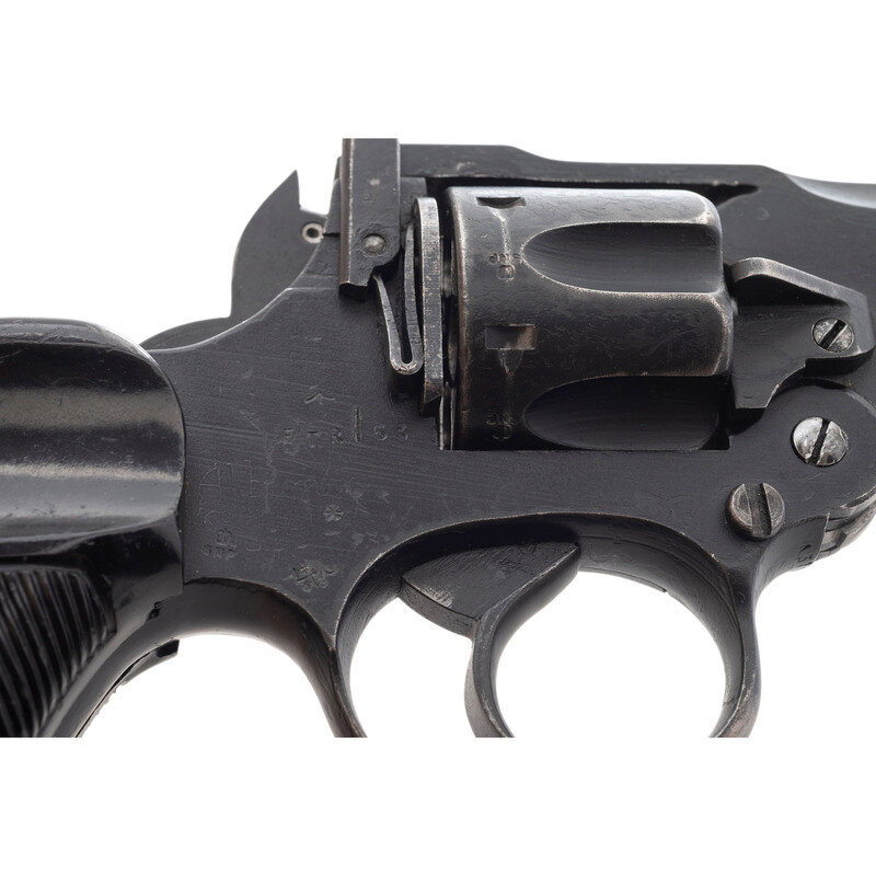 .38 S&W. 5" barrel length. SN: A3135. Black painted arsenal refinish with two-piece diagonally serrated black synthetic grips mounting pinned front blade and latch rear notch sights. DAO top-break six-shot revolver featuring automatic ejector and a lanyard loop to the butt. Right frame shows a faint Albion logo overstamped with FTR/53 below a {Broad Arrow} mark, indicating it was sent back to the factory for repair in 1953. The frame, each chamber, and the barrel show {Crown/BNP} Birmingham proof markings with further marks including faint No. 2 MK I * mark below the Albion motors marking, {Broad Arrow} marks to both grip panels at the butt, and the number 35 hand painted on the butt.
