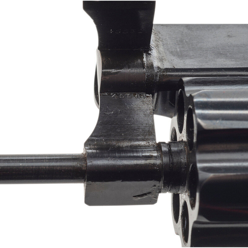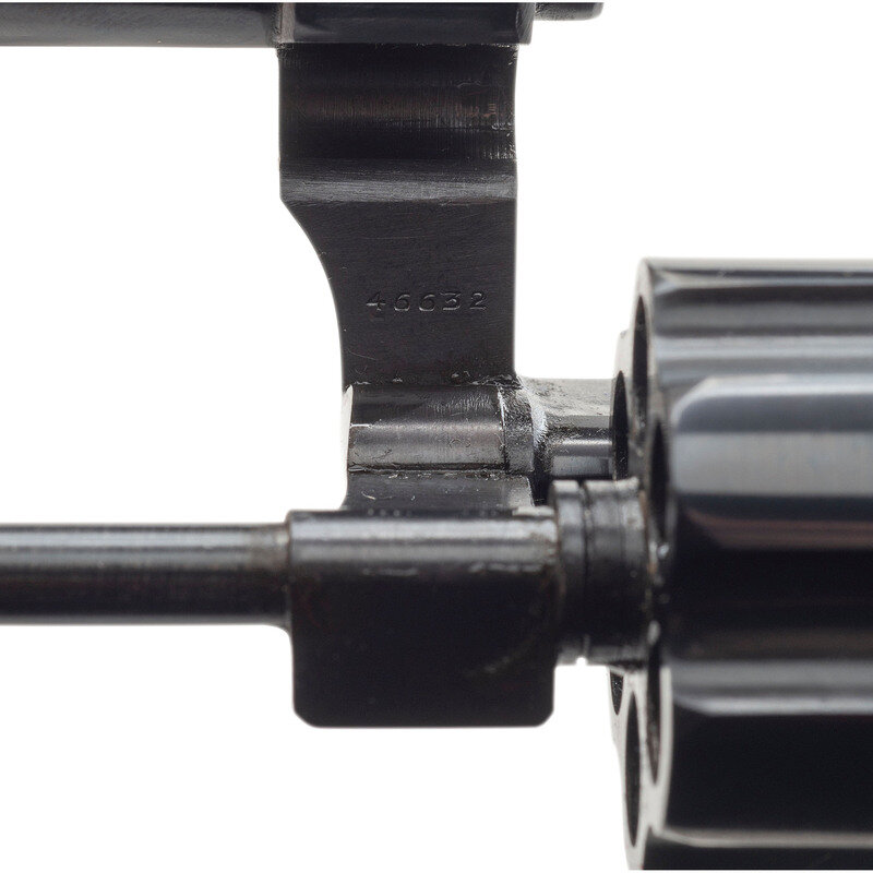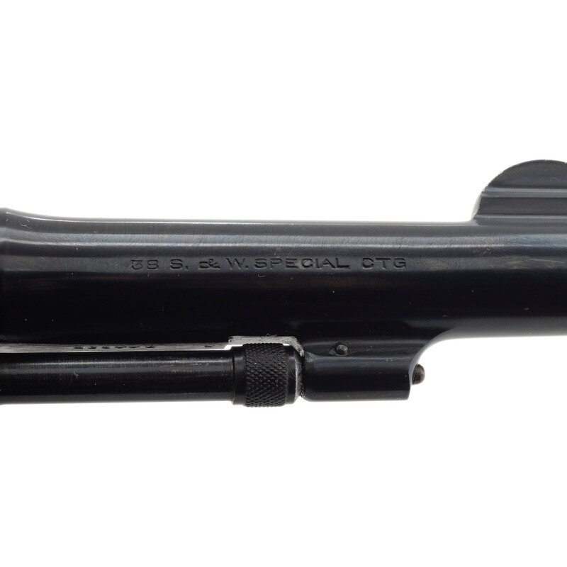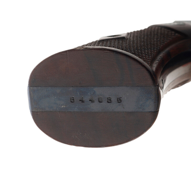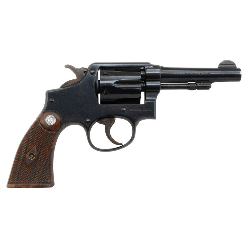 .38 Special. 4" barrel length. SN: 644085. Blued metal finish with casehardened small parts and mounting walnut Smith & Wesson medallion diamond checkered grips. Double action hand ejector six-shot revolver with topstrap notch and forged half-circle front blade sights. Serial numbers match on the cylinder, barrel, star extractor, and on the inside of the right grip panel. Further markings include Smith & Wesson monogram trade mark to the left frame and MADE IN U.S.A. to the right. Assembly number to the inner frame and crane reads 46632. Barrel flanks show standard make and caliber markings while the top of the barrel is marked SMITH & WESSON SPRINGFIELD MASS. U.S.A./PATENTED FEB. 6. 06. SEPT. 14. 09. DEC. 29. 14. Hammer is struck REG. U.S. PAT. OFF. on the back of the hammer.