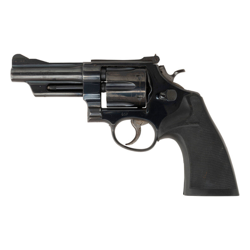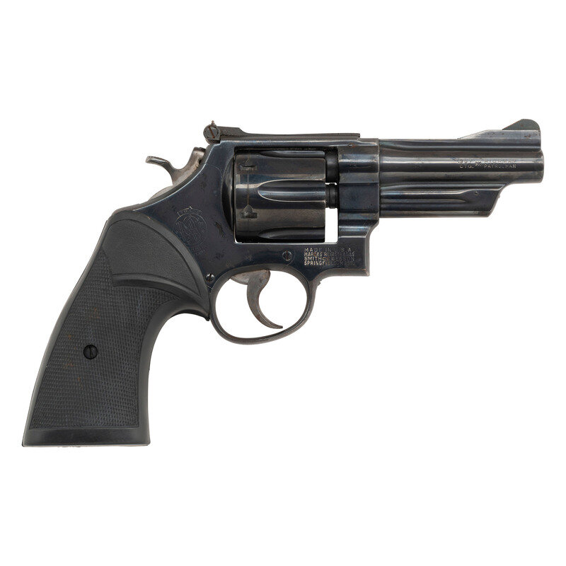 .357 Magnum. 4" barrel length. SN: S175331. Blued metal refinish overall with blued finish to the backstrap of the spur and mounting black rubber Pachmayr grips. Double action hand ejector six-shot revolver. Item mounts adjustable rear notch and matted front ramp sights. Features the four screw frame and pinned barrel construction. Standard make and model marks include four-line address to the right frame, and Smith & Wesson trademark to the sideplate. The left frame has been struck GSP, likely indicating it was once in the possession of the Georgia State Patrol.