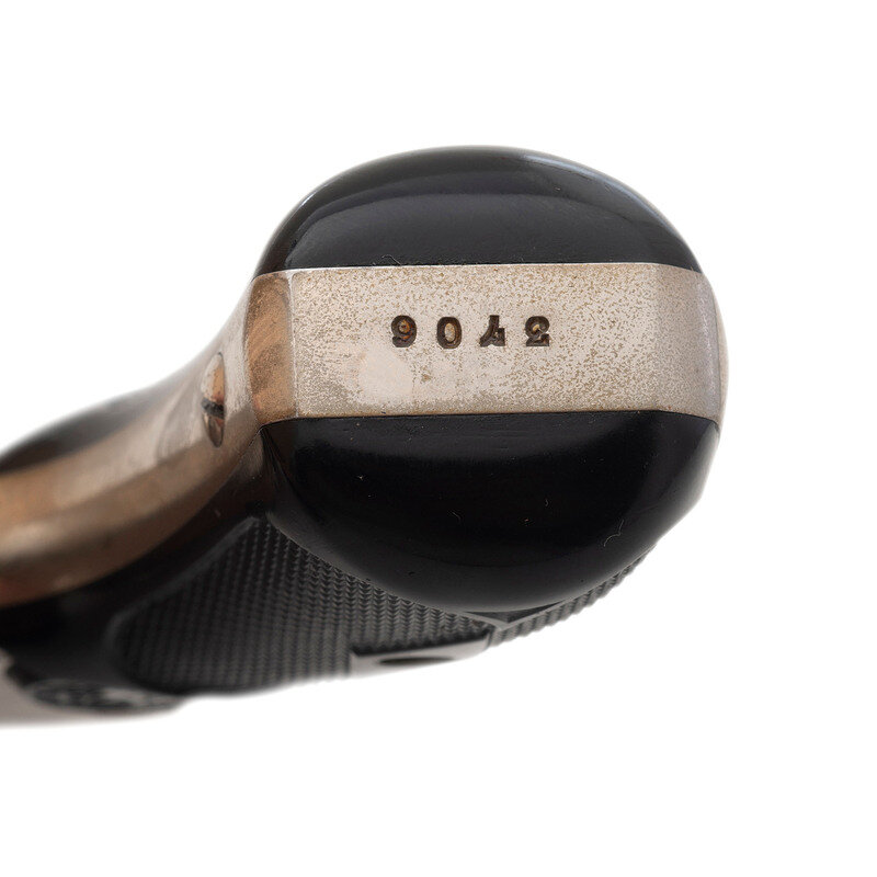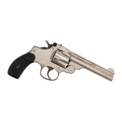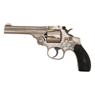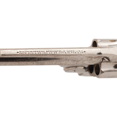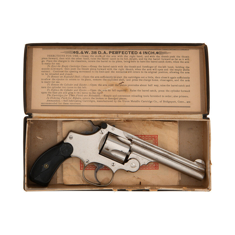 .38 S&W. 4" barrel length. SN: 3706. Nickel plated finish overall with color case hardened hammer and trigger, blued small parts, and mounting Smith & Wesson logo hardrubber grips. Double-action top break auto-ejector revolver mounting latch rear and forged front blade sights. Item features standard make and model markings including Smith & Wesson monogram trade mark on left frame, 38. S. & W. CTG between {Maltese Crosses} on left barrel, and two-line address and patent marking on the fluted barrel rib. Latter mark reads SMITH & WESSON SPRINGFIELD MASS. U.S.A./PAT'D AUG. 4. 96. DEC. 22. 96. OCT. 8. 01. FEB. 6. 06. Revolver shows the left side latch in addition to the topstrap latch. Comes in a period appropriate black hinged lid cardboard box with end label reading SMITH & WESSON/38 D.A. PERFECTED./NICKEL. 4 INCH.