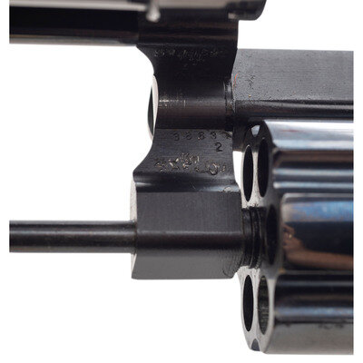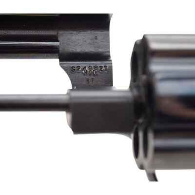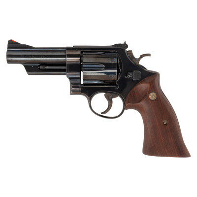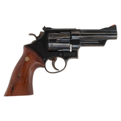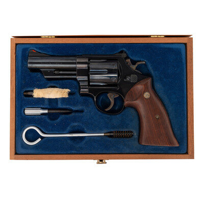 .41 Magnum. 4" pinned barrel. SN: S249621. Blued finish, color casehardened trigger and hammer, smooth varnished oversized S&W medallion target grips. Double action 3-screw N frame revolver with fluted swing out 6-chambered cylinder, white outline adjustable rear sight, ramped front sight with orange insert, .5" checkered target hammer and .5" grooved target trigger. Right side of barrel marked 41 MAGNUM, left side marked SMITH & WESSON. Right side of frame with S&W logo at the rear and four-line address at the lower front. The revolver is contained in a S&W wood case with blue flocked fitted plastic interior. It is accompanied by a cleaning rod with brush, bore mop and screwdriver.
