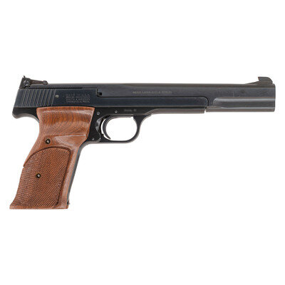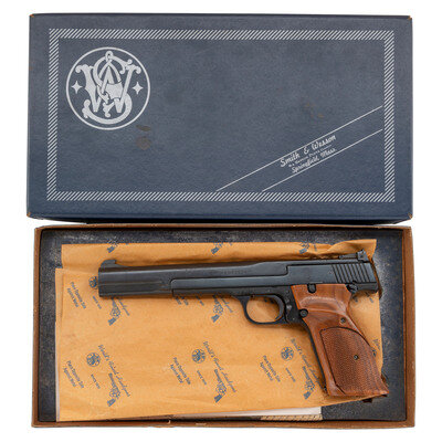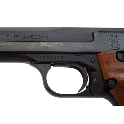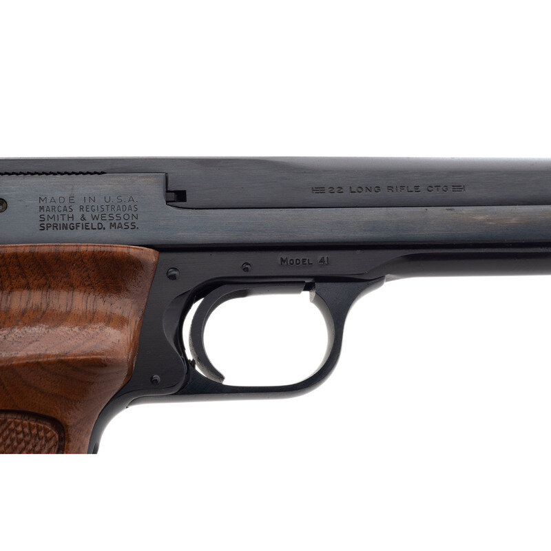 .22 LR. 6.875" barrel length. SN: A537433. Brushed blued metal finish overall with matte finished matted barel top and mounting checkered walnut thumb and finger rest grips. Simple blowback operated internal-hammer fired single action autoloading pistol fed by detachable single stack magazines. Item shows Smith & Wesson's monogram trade mark to the left slide, and four-line address to right. The right frame is struck MODEL 41, and the barrel flanks display standard caliber and maker markings. Item comes in a matching blue cardboard Smith & Wesson marked box with the owner's manual with inserts and one magazine.