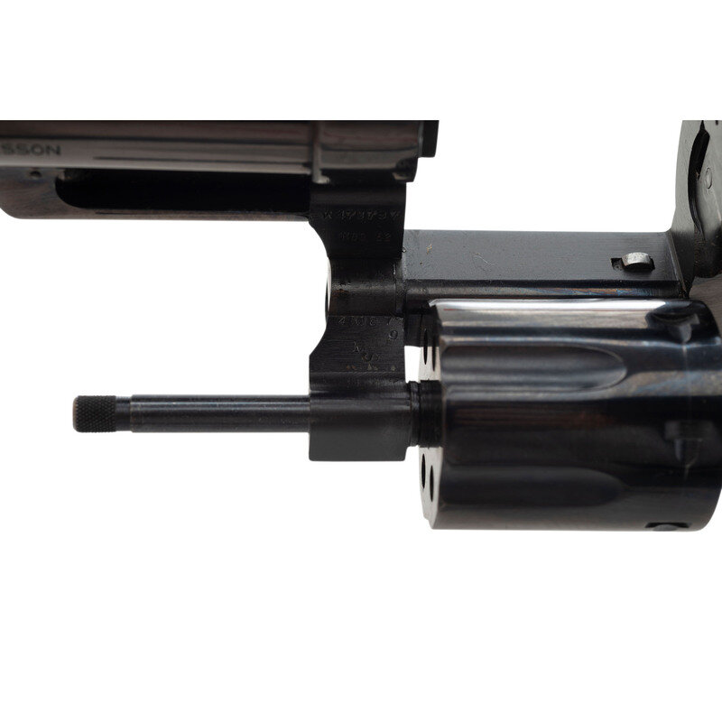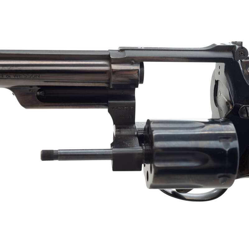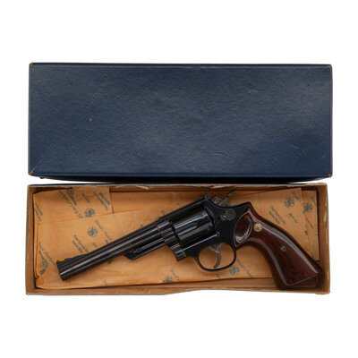 .22 Magnum/.22 LR. 5.875" barrel length. SN: K473797. Blued metal finish with color case hardened frame mounting smooth polished walnut Smith & Wesson medallion grips. Double action hand ejector six-shot revolver featuring adjustable white outline rear and yellow plastic insert Baughman Quick Draw front sights atop a matted barrel rib. Revolver features a pinned barrel and recessed cylinder on a four-screw frame. Item shows MOD. 53 to the interior frame and standard make and model markings overall, including monogram trade mark to the sideplate and four-line address to the right frame. Comes in an unmarked blue cardboard box with a set of six .22 LR conversion sleeves.