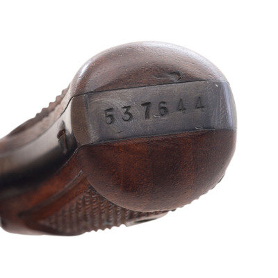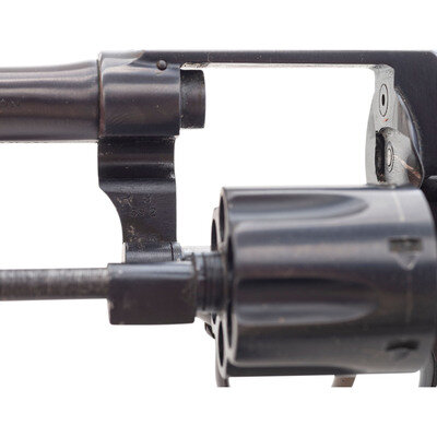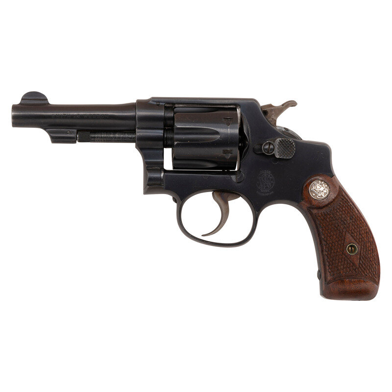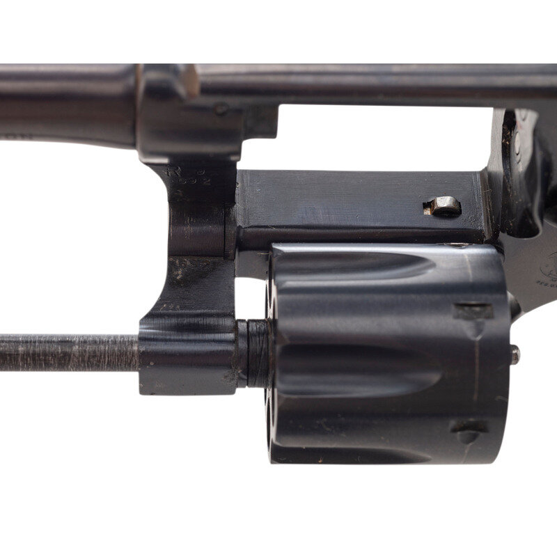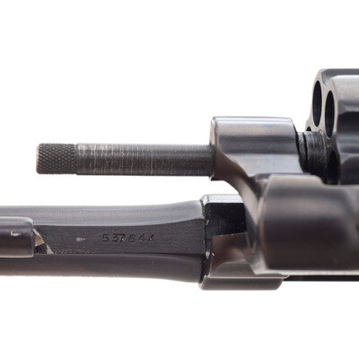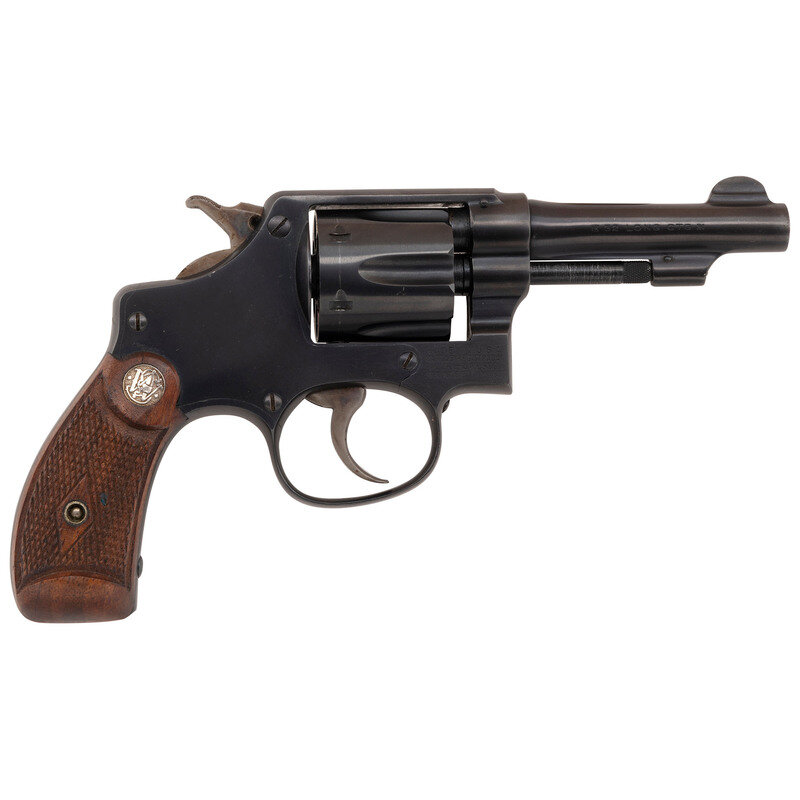 .32 S&W Long. 3.25" barrel length. SN: 537644. Blued metal finish with color case hardened hammer and trigger mounting checkered walnut Smith & Wesson medallion grips. Double action hand-ejector six-shot revolver featuring a pinned barrel and five-screw frame. All serial numbers match. Item mounts half-moon front blade and topstrap notch rear sights. Markings include the Smith & Wesson monogram trade mark to the left frame, SMITH & WESSON on left barrel, and 32 LONG CTG to the right. Standard four-line address marking appears to right frame. Comes in a correct red carboard two-piece box with intact SMITH & WESSON labels.