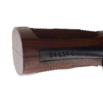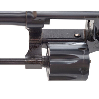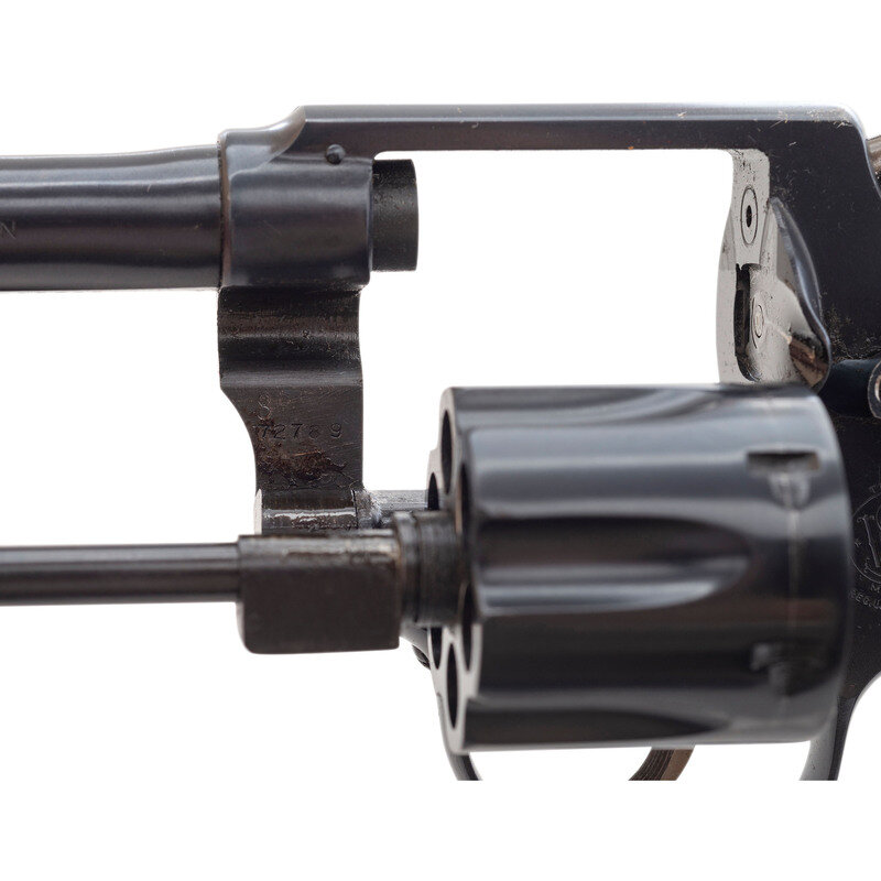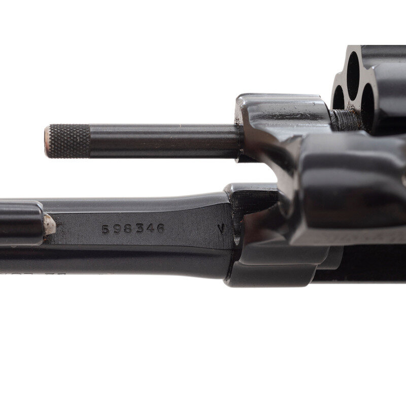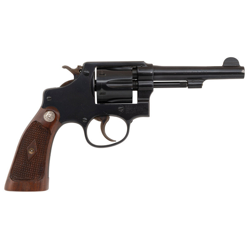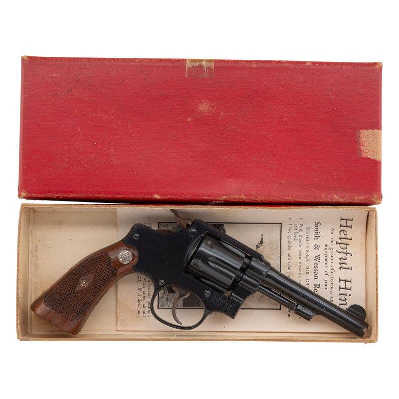 .32 S&W Long. 4" barrel length. SN: 598346. Blued metal finish with color case hardened hammer and trigger mounting checkered walnut Smith & Wesson medallion grips. Double action hand ejector six-shot revolver featuring half-moon front blade and topstrap notch rear sights. Item features a pinned barrel on a five-screw frame. Markings include the Smith & Wesson monogram trade mark on the left frame, four-line address to the right, and the standard make and caliber markings on the barrel. Comes in a correct red cardboard two-piece box with intact end label and shooting manual.