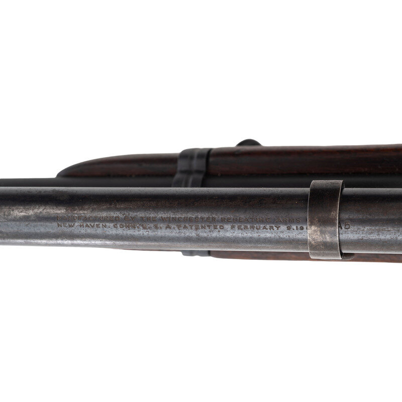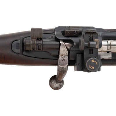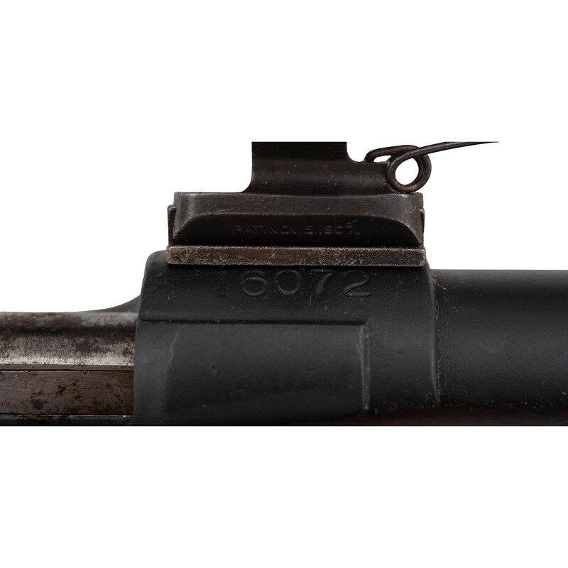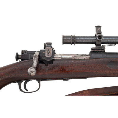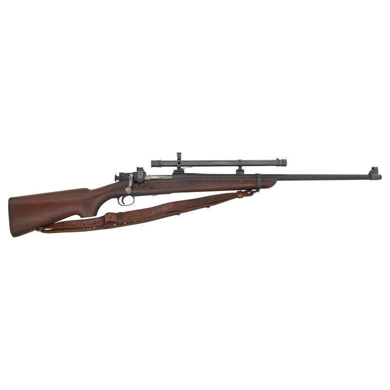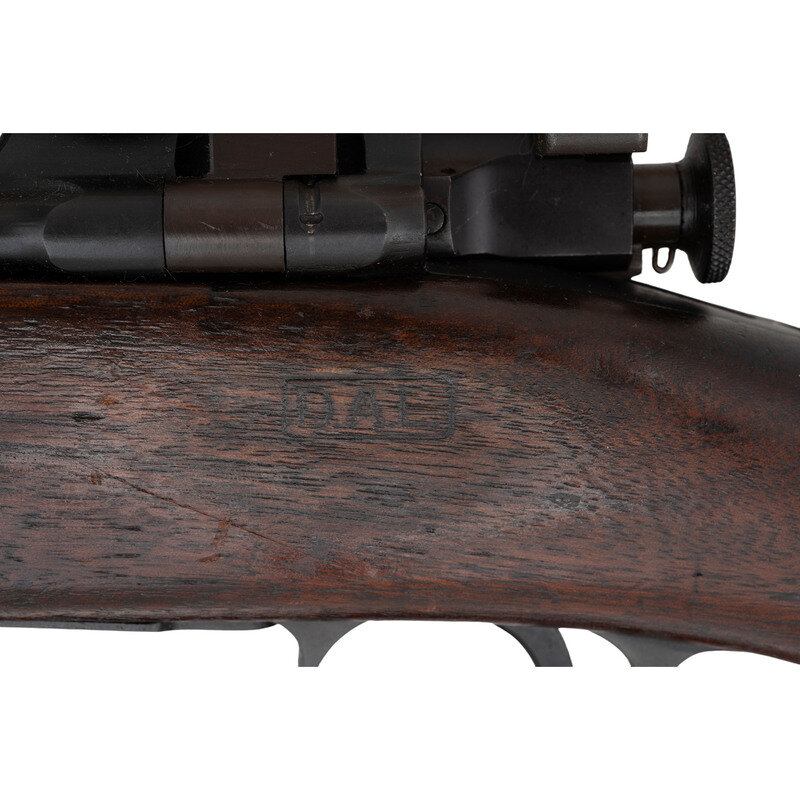 .22LR. 24" barrel length. SN: 16072. Blued metal finish overall with a polished bolt set in a half length semi-pistol grip Walnut stock with finger grooves and L shaped buttplate. Bolt-action repeating rifle fed by detachable single stack magazines and mounting LYMAN/57SME rear and fully hooded front blade sights. Receiver shows the manufacture and model marking U.S./SPRINGFIELD/ARMORY/M1922M1./CAL..22, while the forward barrel is marked SA/{Ordnance Bomb}/6-32, indicating it was made in June of 1932. Stock has been cut for a larger Lyman 48 sight that has been replaced by the smaller Model 57 currently installed, leaving a void in the stock. Barrel and forward receiver are drilled and tapped, and mount Unertl style scope blocks with an installed Winchester A5 marked scope. Left stock shows a boxed DAL cartouche of ordnance inspector Daniel A. Leary, who inspected stocks manufactured from World War I into the 1930s. Bolt is marked NS/M2 on the bolt handle and shows part number C3998. Comes with no magazine.