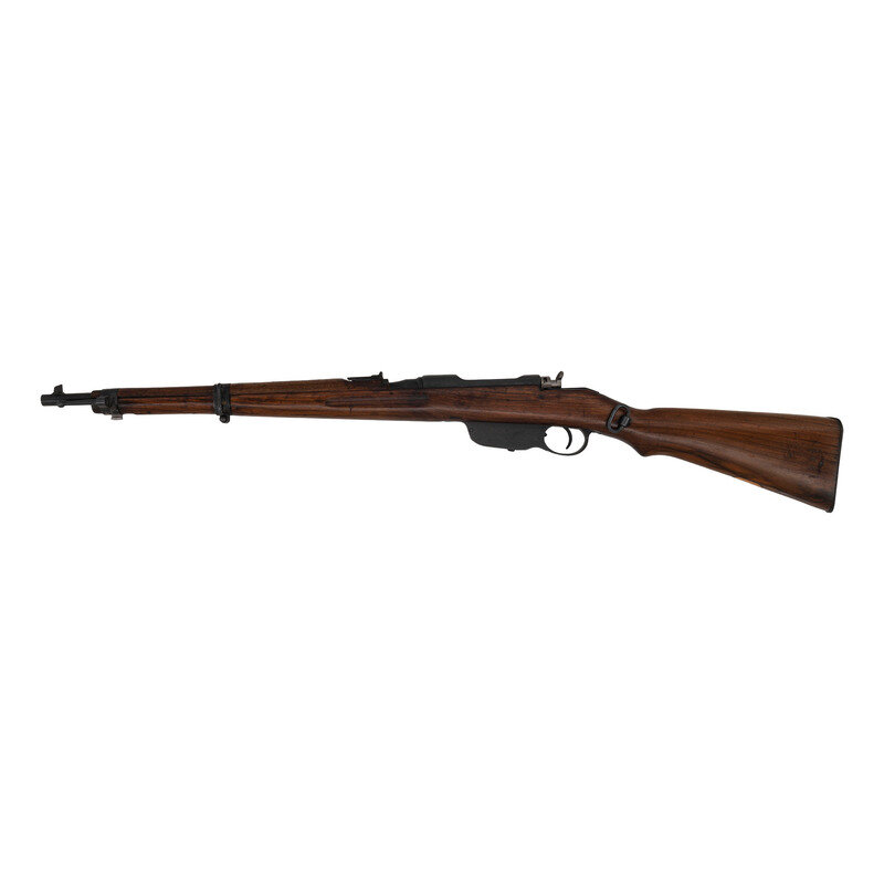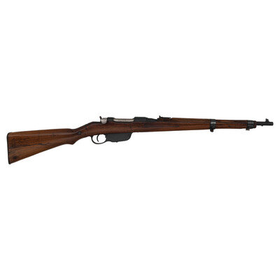 8x56mmR. 19" barrel length. SN: 5725R. Blued metal finish with polished bolt components set in a walnut semi-pistol grip stock with full length upper handguard. Straight pull bolt action rifle fed by an internal magazine charged by en-bloc clips. The receiver is struck {Austrian Eagle}/STEYR/M.95 with the barrel shank displaying a further {Austrian Eagle}, 33 date code, and an S stamp. Port for the sling loop on toe has been filled in with a wood shim with sling swivels now attached at the left wrist and left forend at lower barrel band. The forend features a bayonet lug. Importer mark at forward barrel reads M95 AUSTRIA 8X56R/C.A.I. ST. ALB. VT.