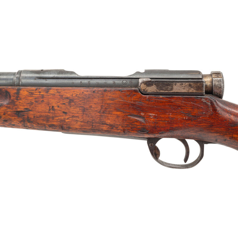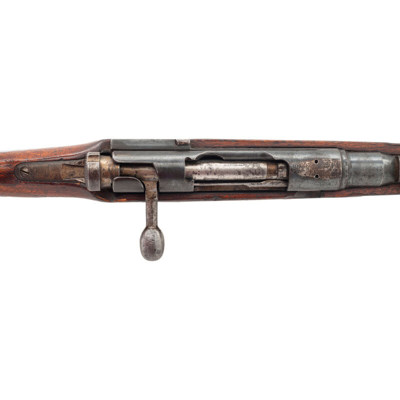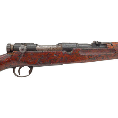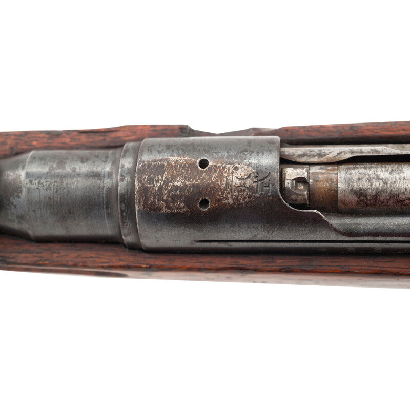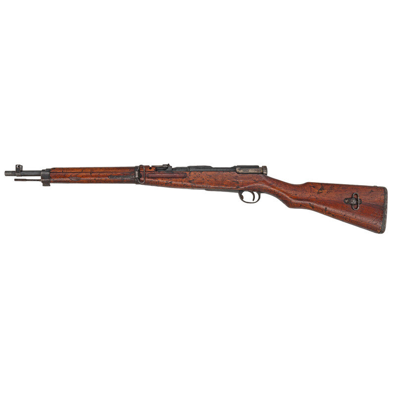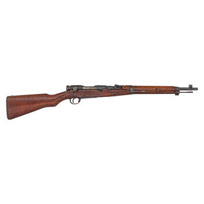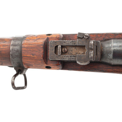 6.5x50SR Arisaka. 19.25" barrel length. SN: 33997. Blued military finish. Hardwood stock has a plain semi pistol grip and forearm, with handguard and grasping grooves. Bolt action rifle with adjustable folding ladder notch rear sight and blade front sight with ear protectors. Item features a bayonet lug forend, internal magazine, and double side mounted sling swivels. Chrysanthemum has been ground.