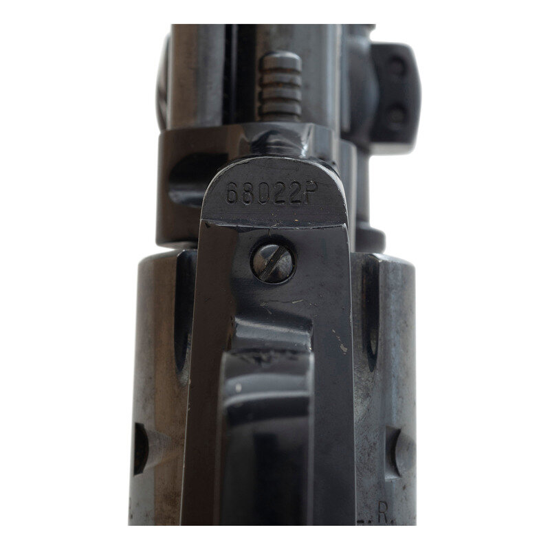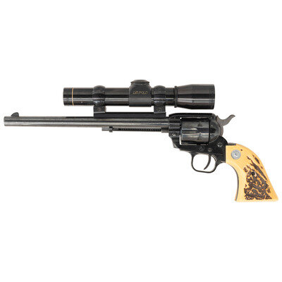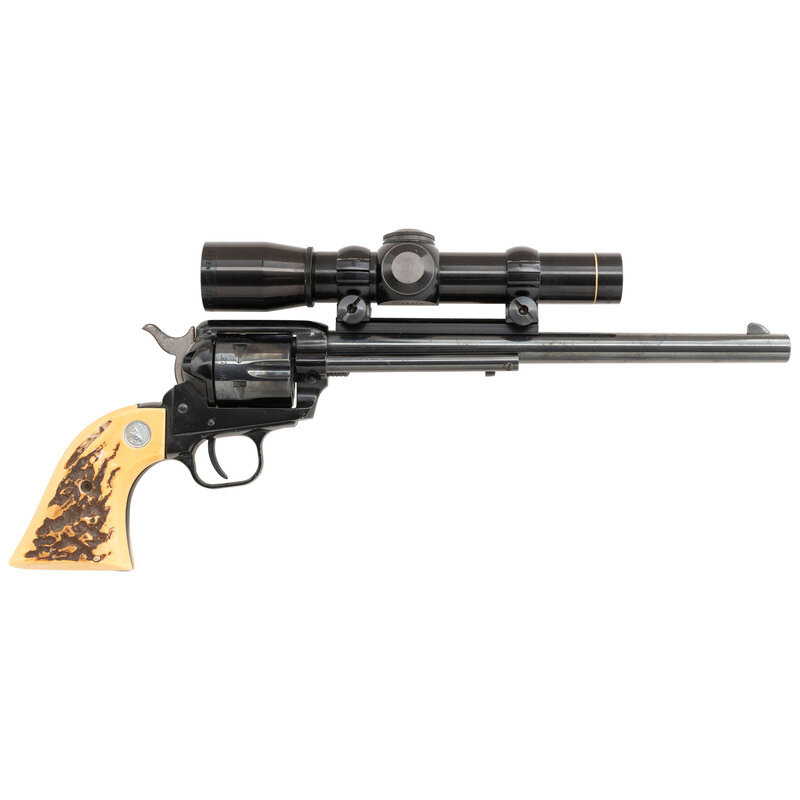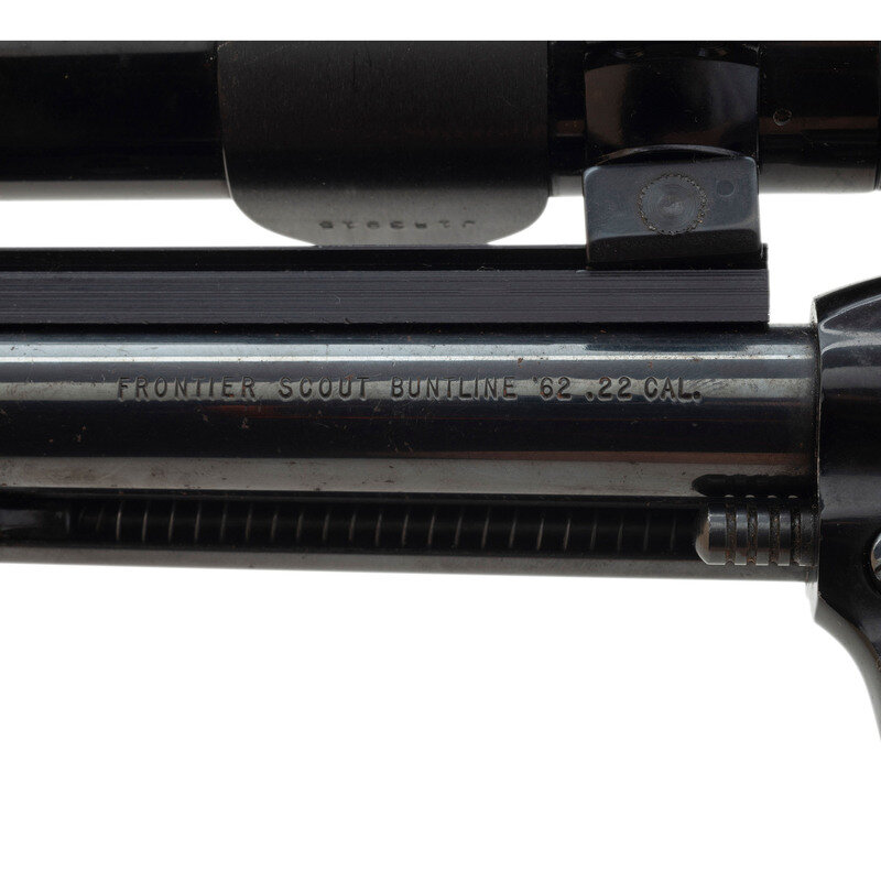 .22 LR. 9.5" barrel length. SN: 68022P. blued metal finish with polished hammer flanks and mounting imitation stag horn Colt medallion grips. Single-action loading gate revolver patterned after the Single-Action Arm revolver and featuring a six-shot cylinder and mounting a Leupold M8-2X EXTENDED E.R. telescopic sight on a dovetail mount. Shows standard make and model markings with the left barrel reading FRONTIER SCOUT BUNTLINE '62 .22 CAL.