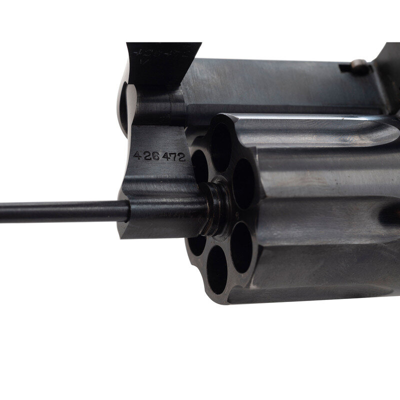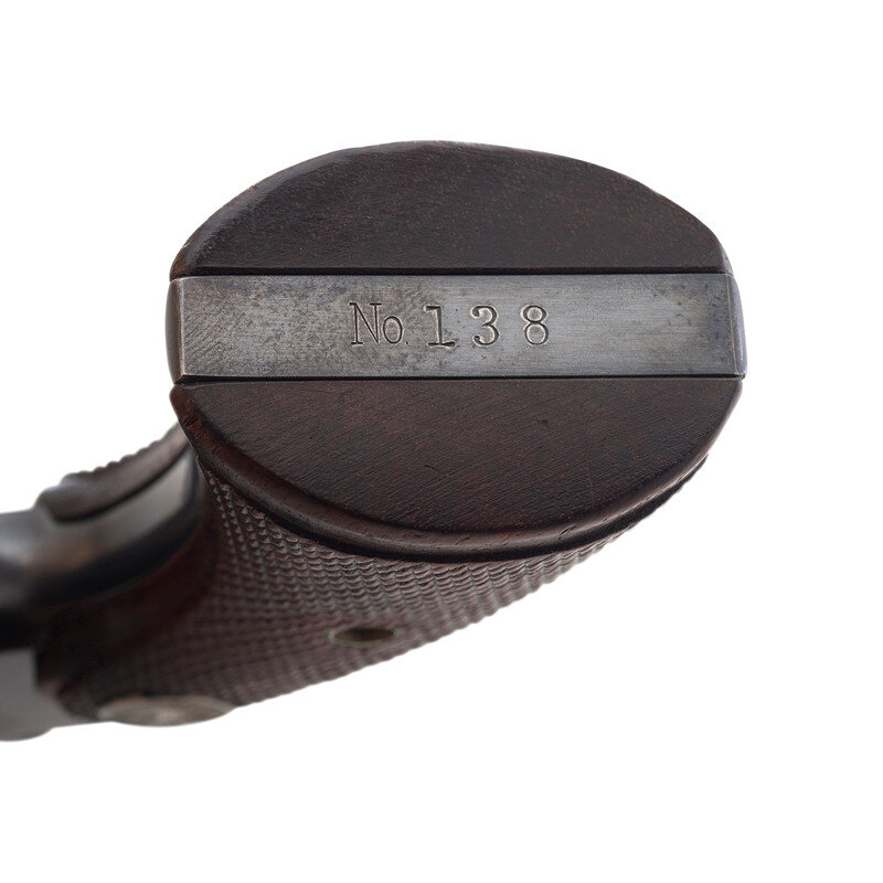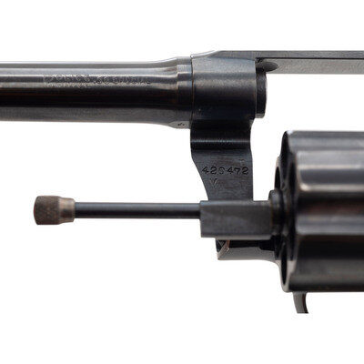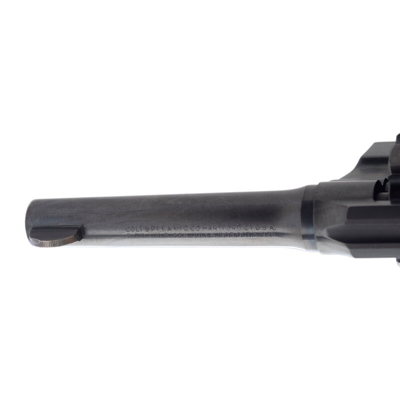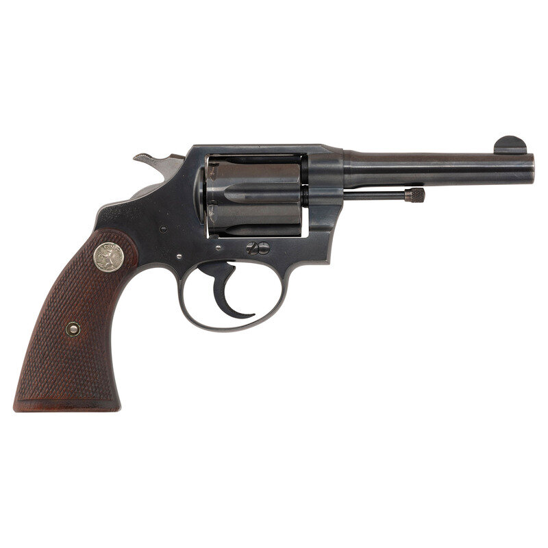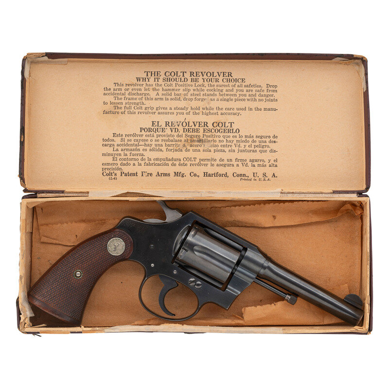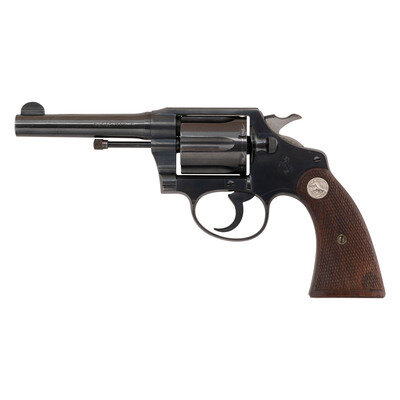.38 Special. 4" barrel length. SN: 426472. Blued metal finish with polished hammer flanks mounting checkered walnut Colt medallion grips. Double action hand ejector six-shot revolver mounting half-moon front blade and topstrap notch sights. Standard markings include {Rampant Colt} logo to the left sideplate and POLICE/POSITIVE .38 SPECIAL on the left barrel. Top of the barrel shows two-line address and patent mark reading COLT'S PT. F.A. MFG. CO. HARTFORD, CT. U.S.A./PAT'D AUG. 5. 1884. JULY 4. 1905. OCT. 5. 1926. The backstrap is inscribed U.S. MINT with the butt displaying rack number No. 138. Comes in a folding lid Colt marked black cardboard box with a yellowed label bearing the serial number taped in place.