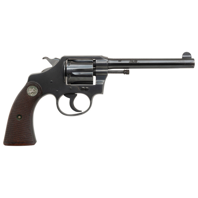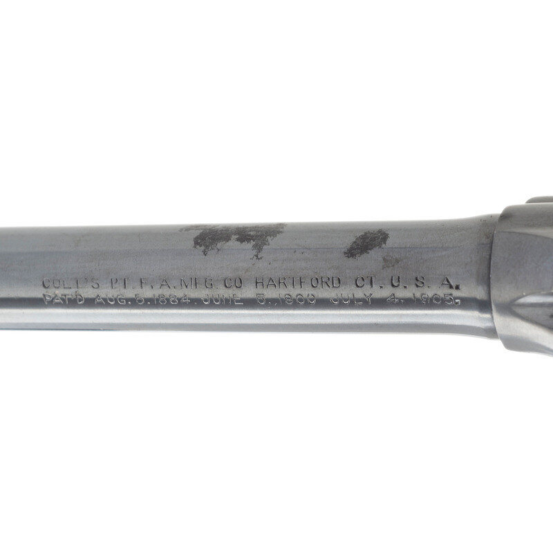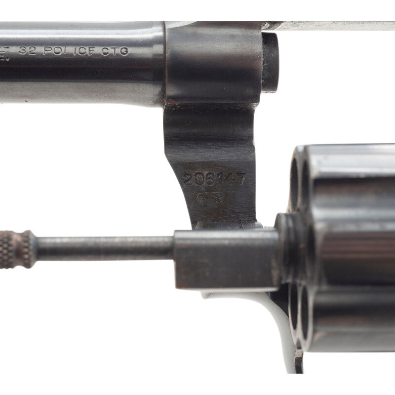 .32 S&W Long. 4.875" barrel length. SN: 206147. Blued metal finish with polished hammer flanks mounting checkered walnut Colt medallion grips and featuring topstrap notch and semi-circular front blade sights. Double action six-shot hand ejector revolver with knurled hammer spur and smooth trigger. Markings include a two-line address and patent mark to the top of the barrel reading COLT'S PT. F.A. MFG. CO HARTFORD. CT. U.S.A./PAT'D AUG. 5. 1884. JUNE 5. 1900 JULY 4. 1905. with some skips and weakness to the marking. Left barrel is marked POLICE/POSITIVE. 32 POLICE CTG. Standard Colt VP monogram proof marking appears on the left triggerguard, and the sideplate shows a {Rampant Colt} mark.