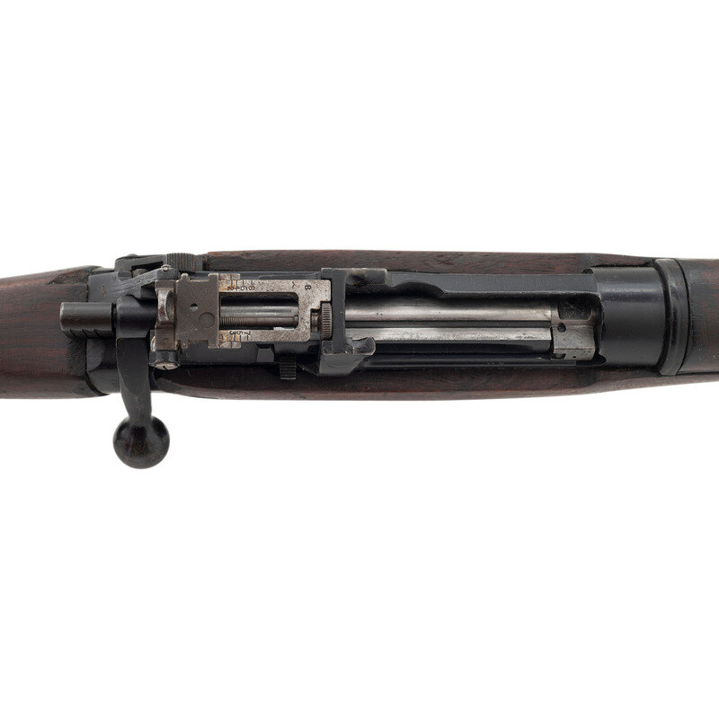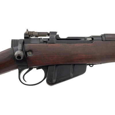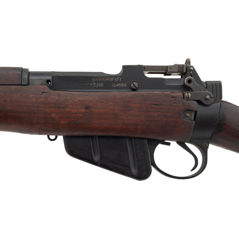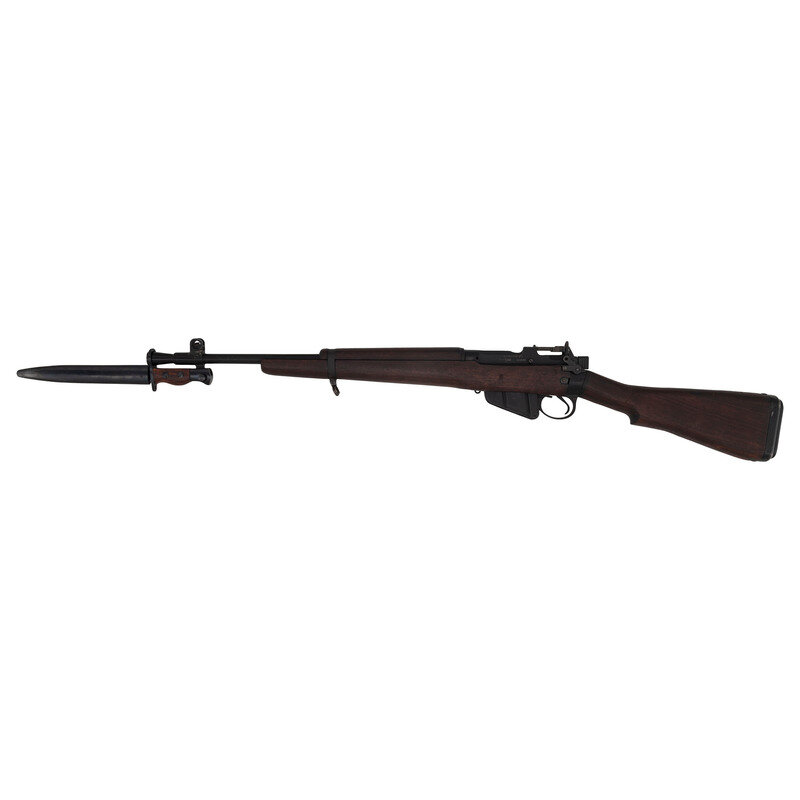 .303 British. 20.5" barrel length. SN: 04854. Black painted finish. Walnut stock has a plain semi pistol grip and forearm, with handguard. Bolt action rifle with adjustable folding rear peep sight and blade front sight with ear protectors. Item features an integrated box magazine, hook trigger, flash suppressor, rubber recoil pad, and double sling loops. Includes a replica RFI No.5 MK 1 bayonet.