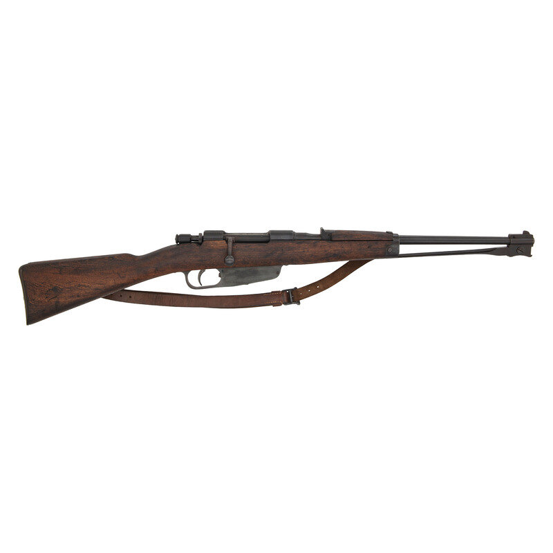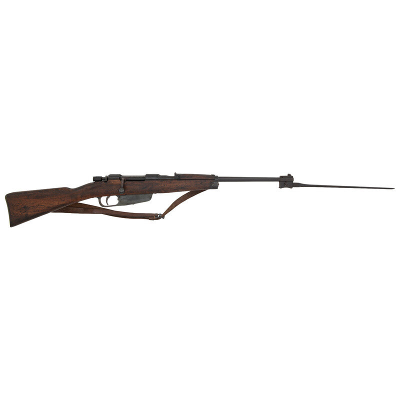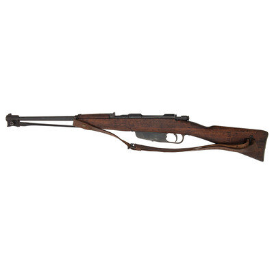 7.35x52mm. 18" barrel length. SN: C1638. Blued metal finish overall set in a straight wrist Walnut stock with folding spike bayonet and fixed rear notch and front sights. Bolt-action repeating rifle fed by an internal box magazine charged with en bloc clips. Barrel shank shows the {Crown/RE/TERNI} manuafacturer marking with the right side showing FP/TERNI/1939 XVII, indicating it was made in 1939. Serial numbers match on the bolt, barrel, bayonet lug, and on the left stock near butt. Left stock is struck with the caliber marking CAL 7.35 followed by the Terni seal with date 1939. Item mounts a leather sling with no legible markings.