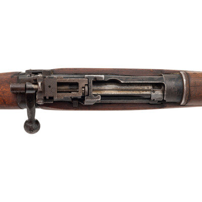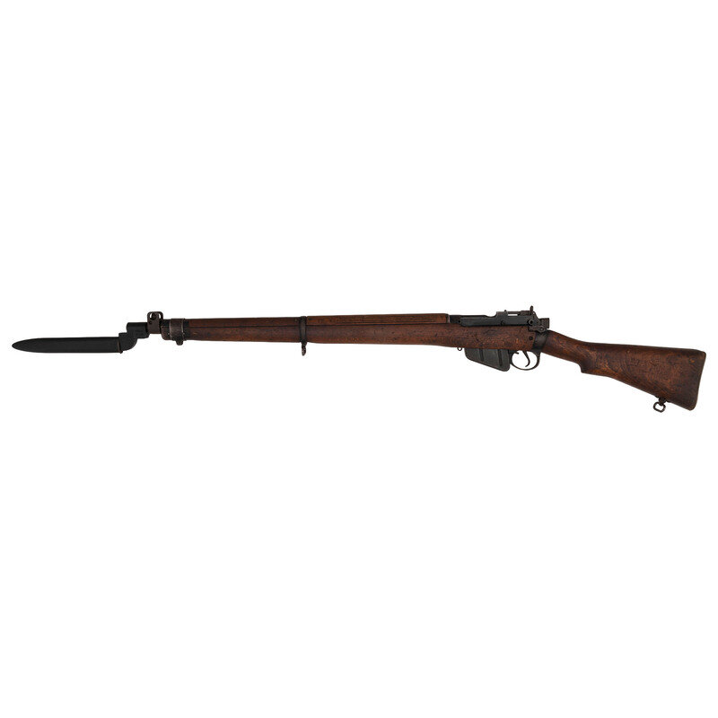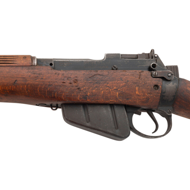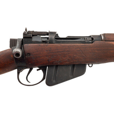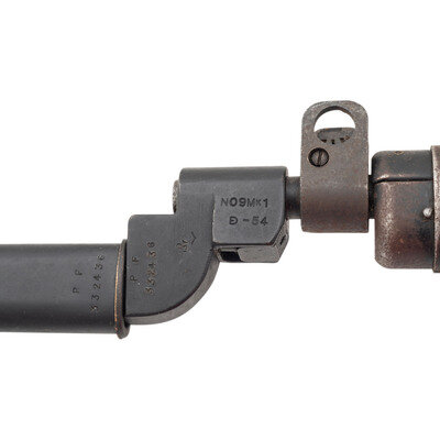 .303 British. 25" barrel length. SN: PF104898. Black "paint over" finish. Hardwood stock has a plain semi pistol grip and forearm, with grooved handguard and single barrel band. Bolt action rifle with an adjustable folding micrometer rear peep sight and blade front sight with ear protectors. Item features an integrated box magazine, double sling swivels, and a brass trapdoor buttplate void of contents. Includes a No. 9 Mk I bayonet with scabbard.