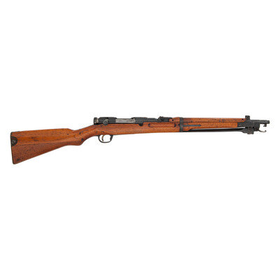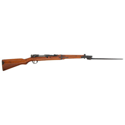 6.5x50mm. 19.2" barrel length. SN: 36472. Blued metal finish with polished bolt and straw colored trigger set in a full length wood semi-pistol grip stock with spliced toe. Bolt action repeating rifle fed by an internal box magazine using a cock on close action and mounting an underfolding spike bayonet. Receiver shows the standard kanji markings for Type 44 but the {Imperial Chrysanthemum} has been ground off. Left receiver is struck with the stacked cannonball {Koshikawa Arsenal} marking beside the serial number with the S proof on the barrel and Circle Triangle proofs on the left barrel and the top of the receiver. Serial numbers match on the bolt, cocking knob, magazine floorplate, and the receiver, but the firing pin is not numbered and the bayonet lug does not match. First variation stock with two holes for each half of the cleaning rod, which is not present.
